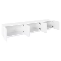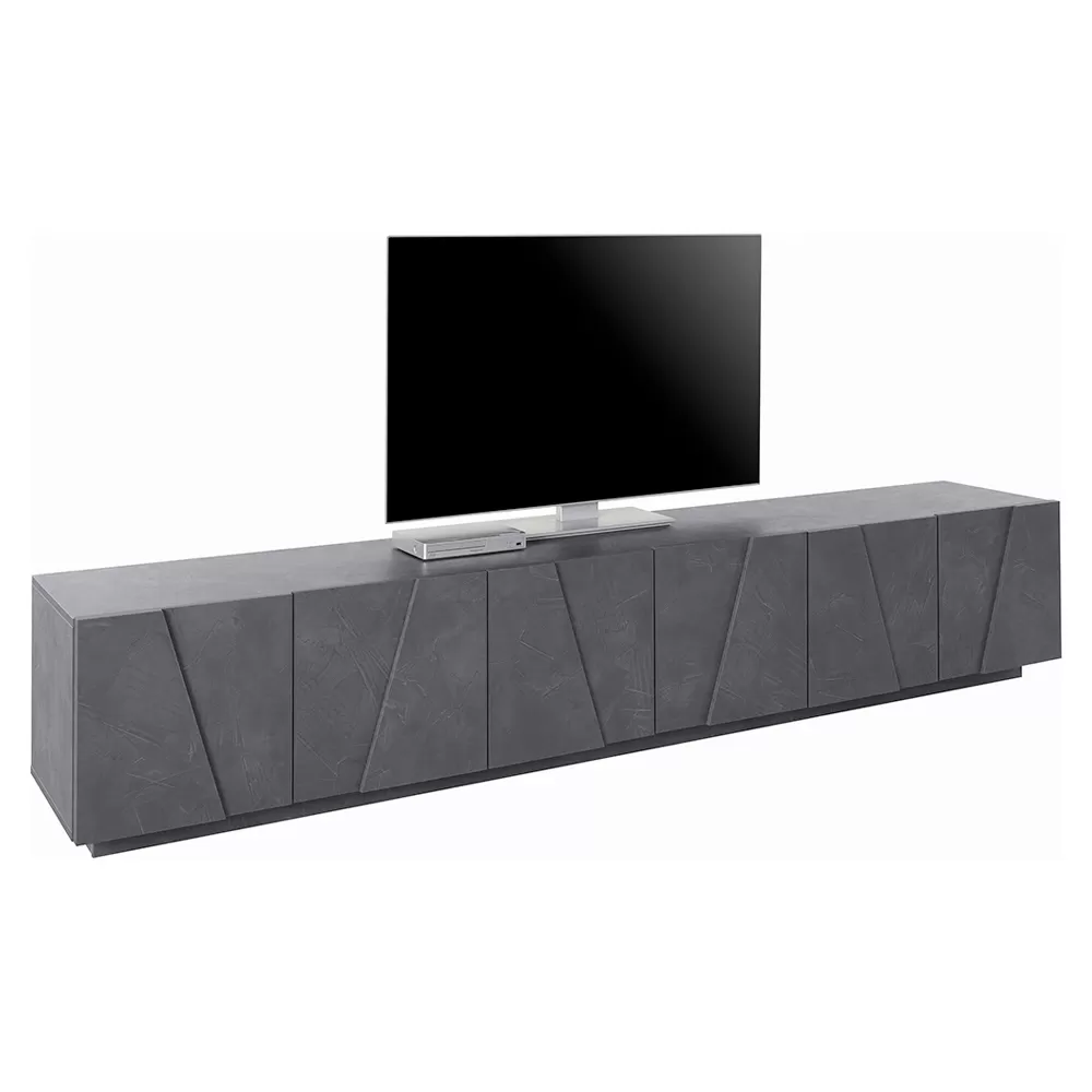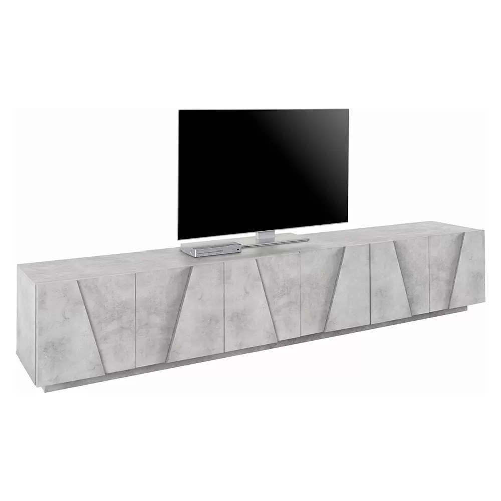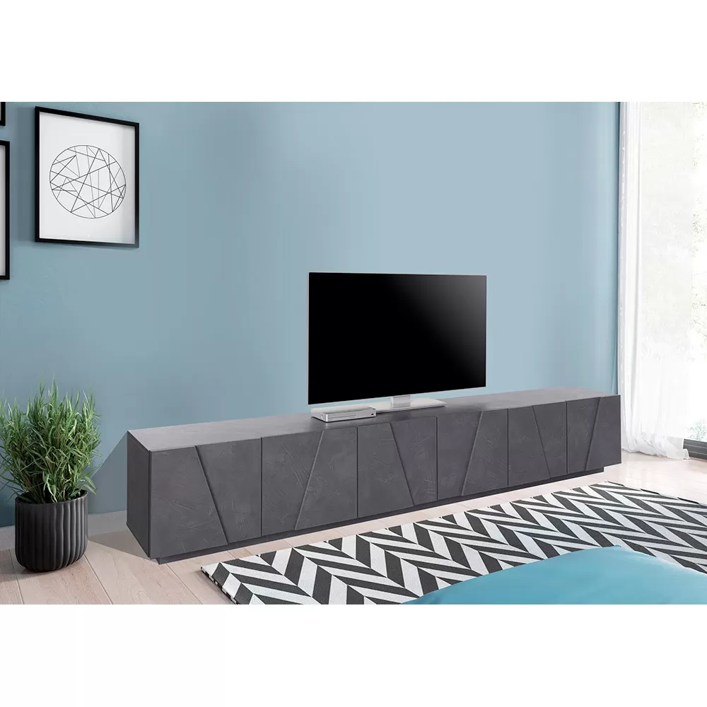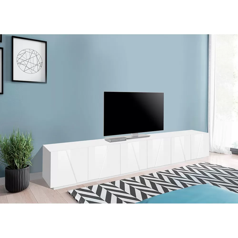 The TV cabinet is made up of 6 hinged doors made special by the geometric carving in relief on the surface, closing off 3 storage compartments , which guarantee great storage space. It is made of melamine and 100% Made in Italy . This product lends itself to completing the decor of any living area thanks to its simple and elegant finishes that give the room a unique and unforgettable touch. The material used guarantees quality and resistance even over time.
