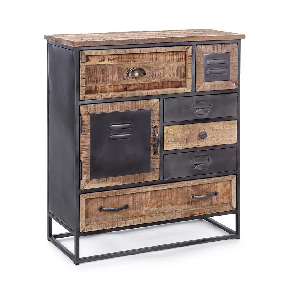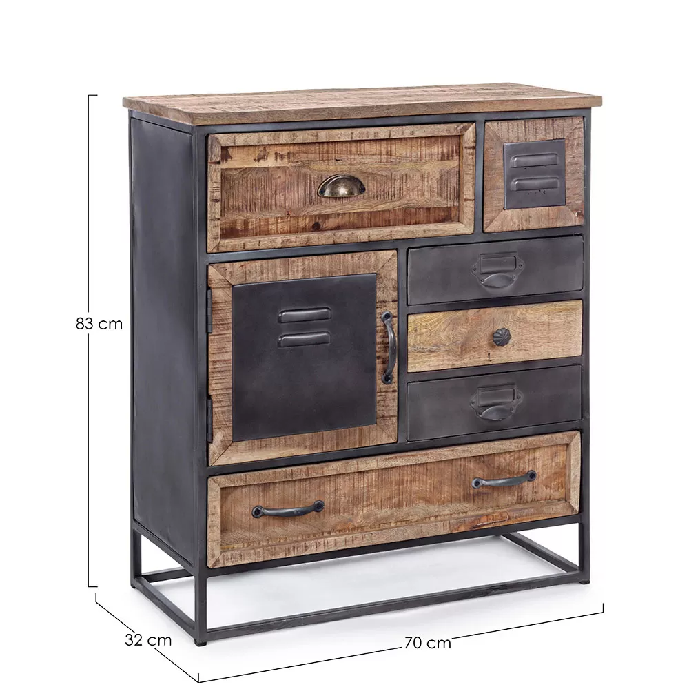 Chest of drawers in steel and acacia wood with one door and 6 drawers.