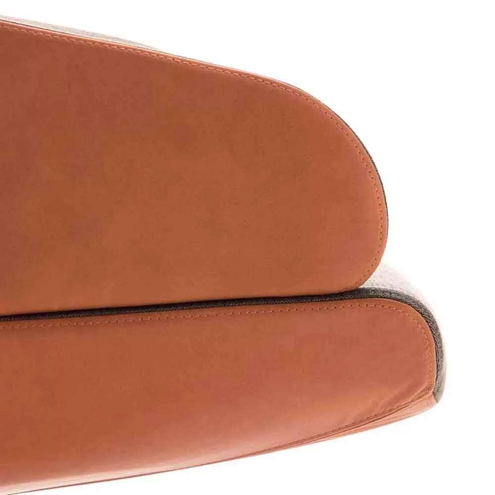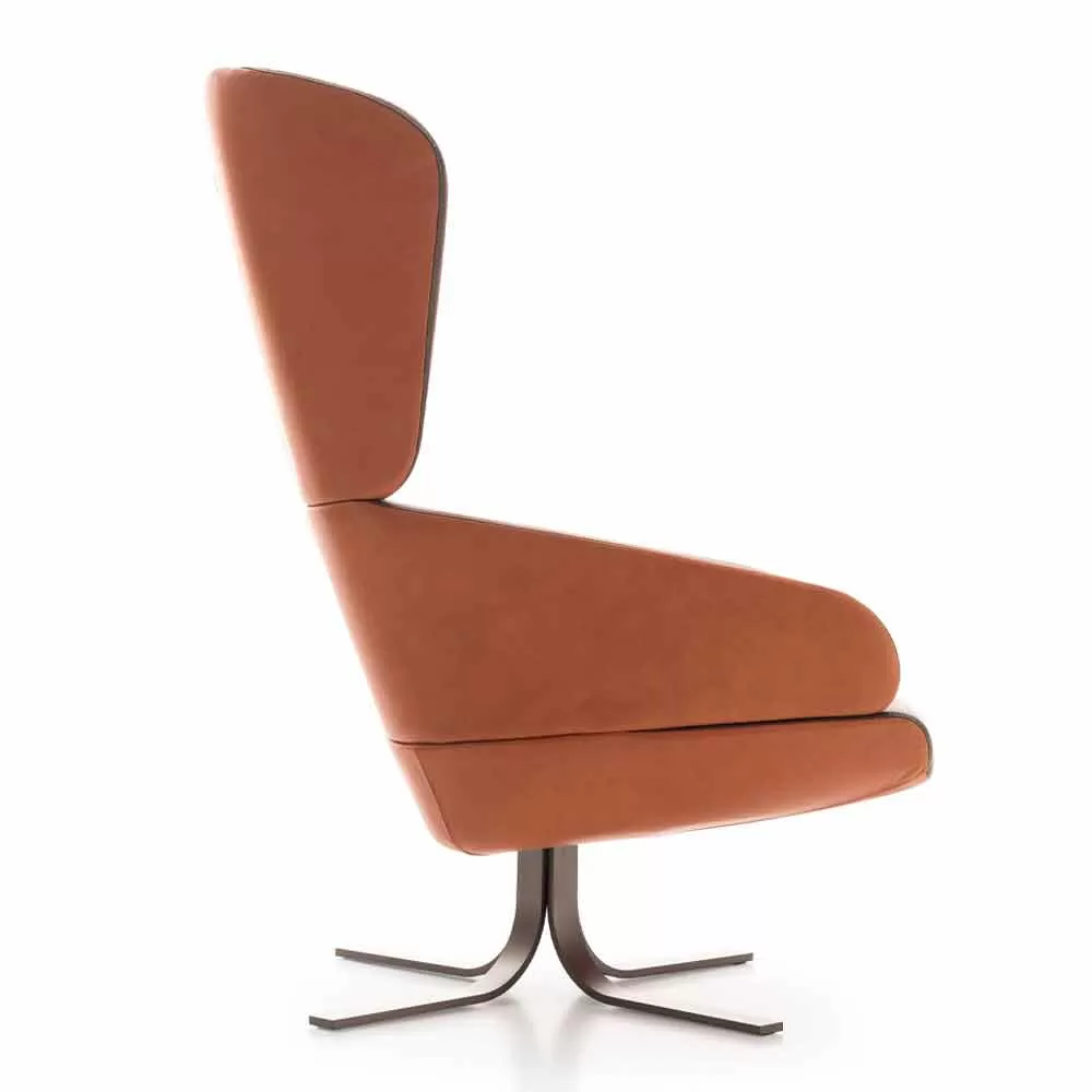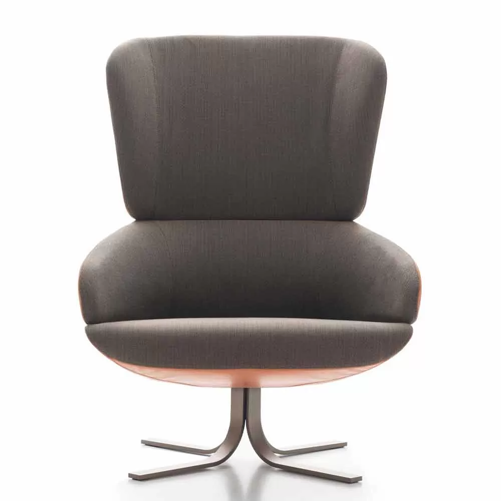 Modern living room armchair made in Italy with swivel base in anthracite finish metal and internal steel frame, padded with non-deformable polyurethane foam and covered in fabric with external cover in leather (not removable). Functionality and elegance are the strengths of this furnishing accessory characterized by a shaped shell enriched by passing seams that emphasize its shapes and volumes. The harmony of its lines contains all the comfort that the armchair offers together with an extremely innovative and original design made unique and particularly interesting by the creative swivel base. Ideal for modern living areas in which to complete the furniture with an exclusive touch, managing to enrich the surrounding aesthetics with personality and class.
