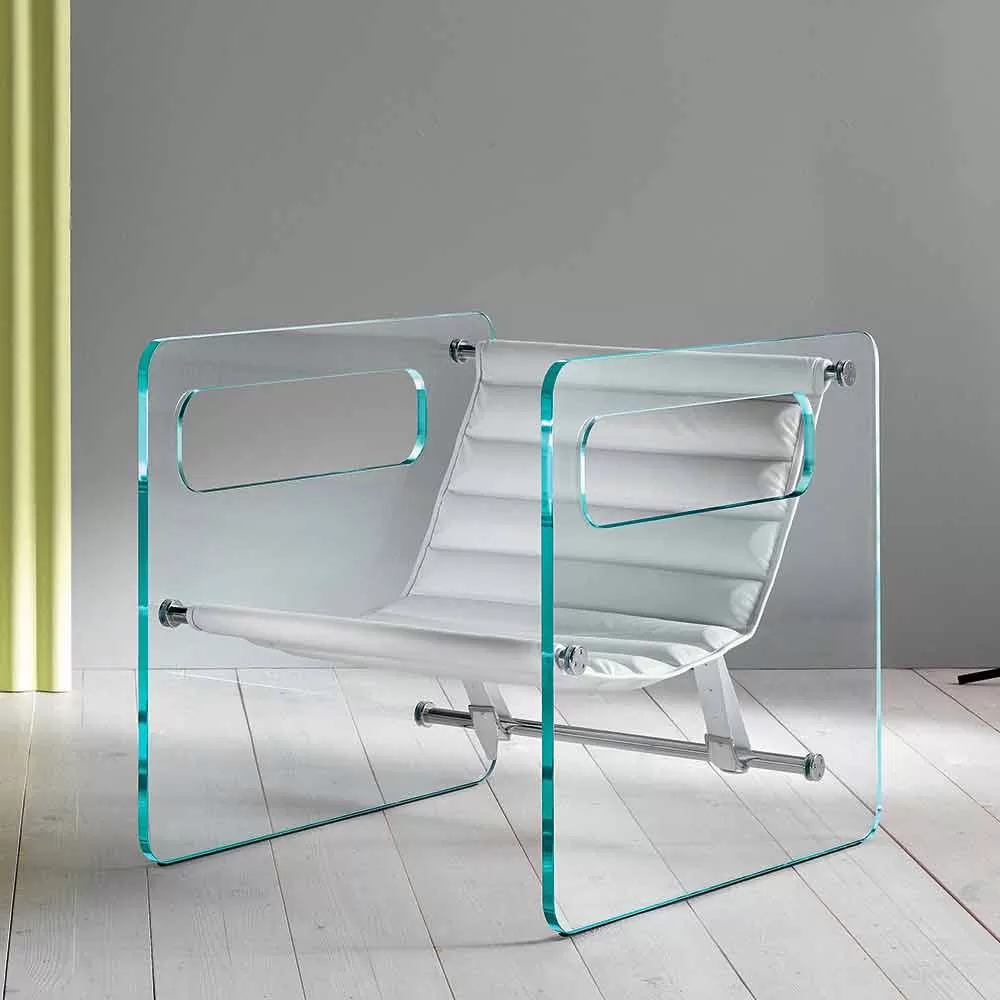 Glass armchair with adjustable seat in white leather, fine item but de in Italy.
