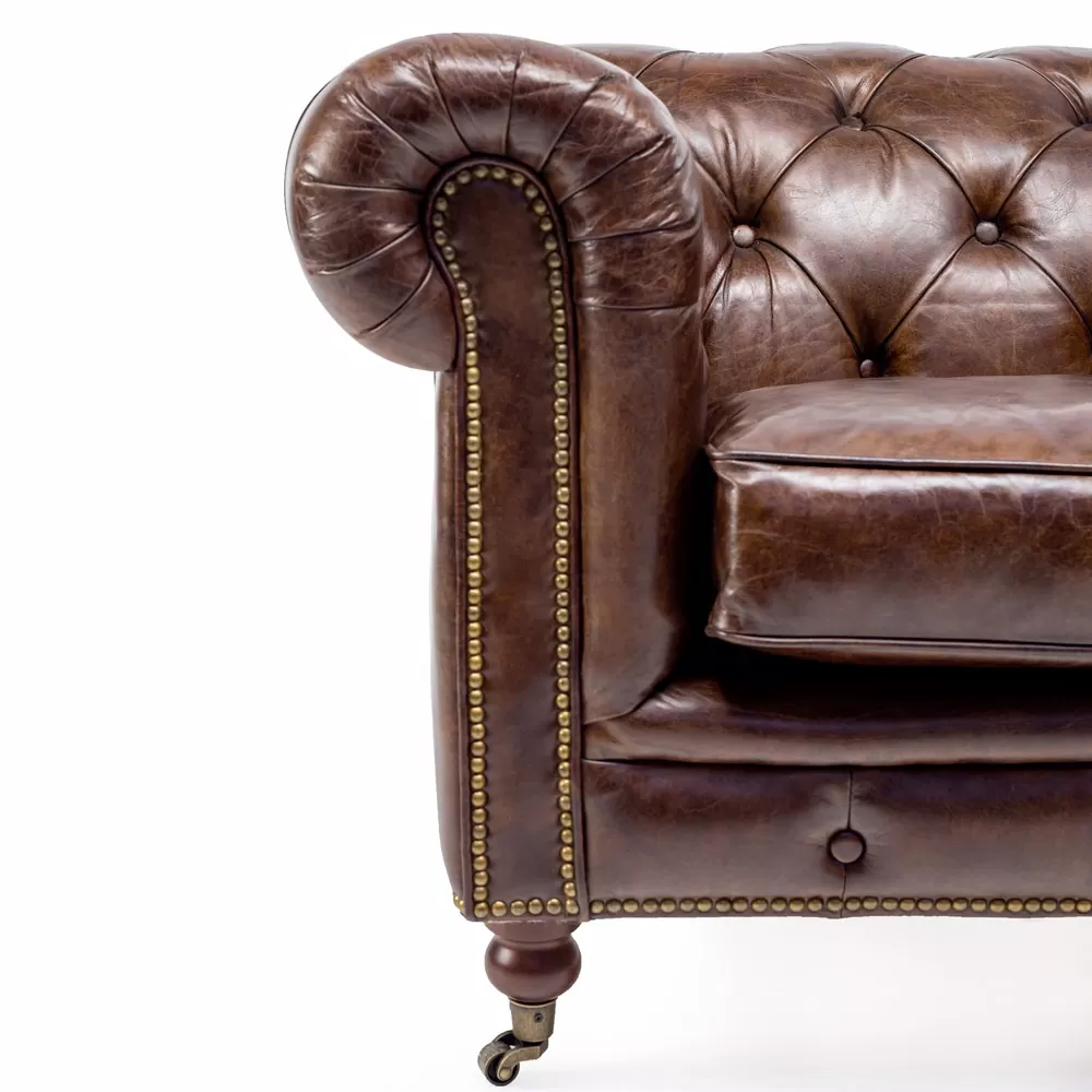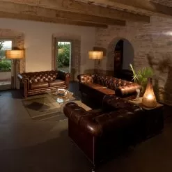 This armchair is part of a collection that can boast a timeless beauty and taste that resists the passing of fashions and the suggestions of trends. Solid and robust structures , capitonnée workmanship, manual punching and nailing, upholstery in real leather (fior di pelle) , worked with a particular tanning, specially designed to give the leather a vintage, aged look . The products in this collection are characterized by the refined importance of the shapes and precious materials that animate them. These seats are perfect for embellishing high-level furnishing environments, which make elegance and character their prerogative.