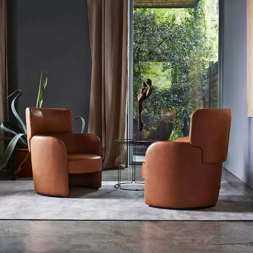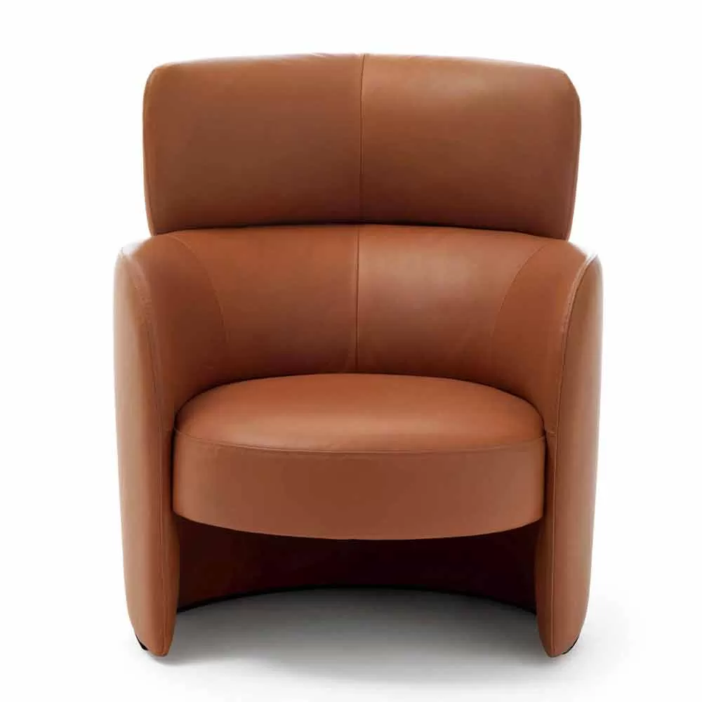 Refined living room armchair made in Italy with black finish wooden base on which rests the plywood shell padded with non-deformable polyurethane foam and completely covered in leather (not removable). Soft and decisive lines come together to create a particularly comfortable furnishing solution capable of recreating the feeling of a welcoming embrace thanks to the curved backrest, thus making every moment a real cuddle. The elegance of the leather enhances its sophisticated and classy style even more, making it perfect for the most varied living environments in which to enrich the furniture with a complement that can offer unparalleled comfort while at the same time giving an exclusive and original touch to the own living room.