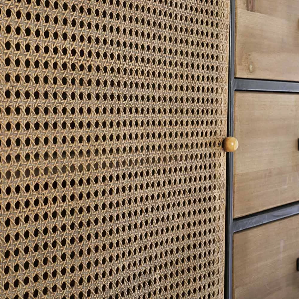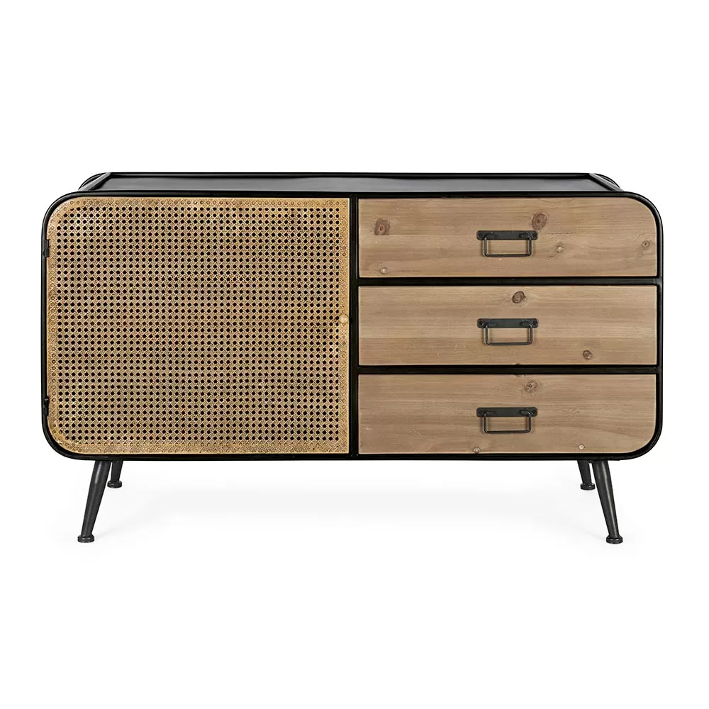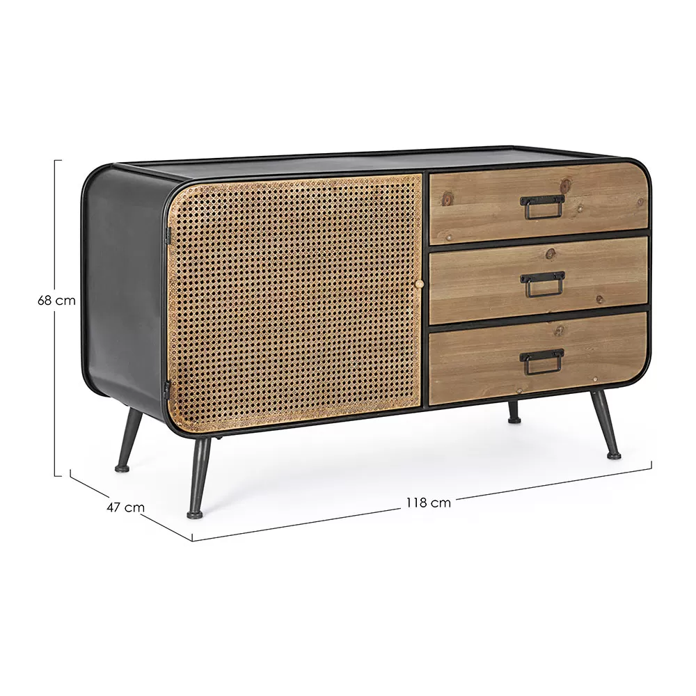 Sideboard in steel with 3 wooden drawers and rattan effect door, ethnic style.