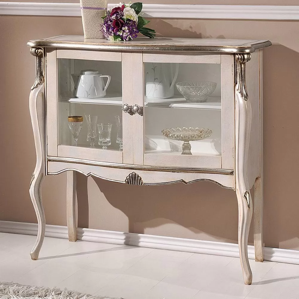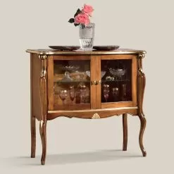 Classic style living room display cabinet made of wood and complete with 2 elegant glass doors, ideal for decorating your living room with timeless elegance. Available in two variants: Bassano walnut and antique gold finish or in white and silver wood .