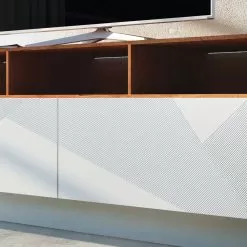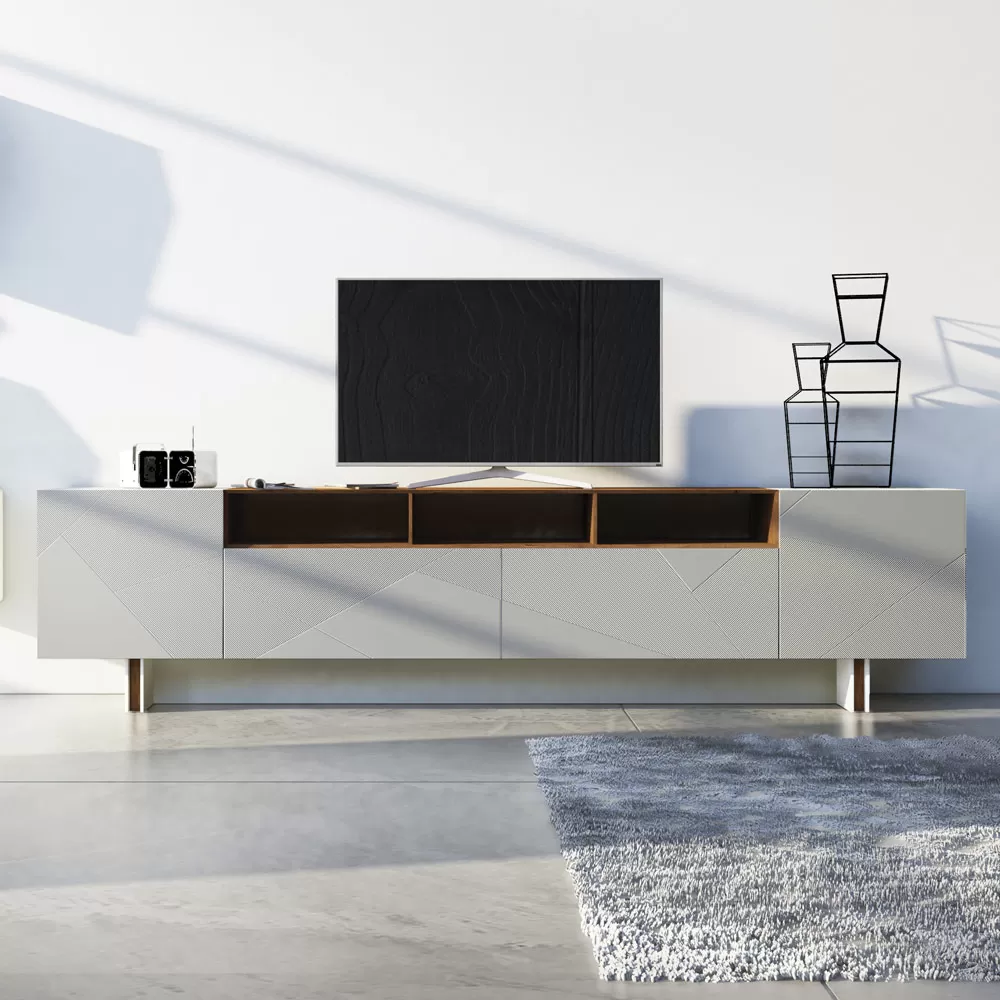 Living room sideboard with matt lacquered MDF structure consisting of 2 hinged doors and 2 drawer doors that guarantee great functionality and practicality. The oak display case and the light gray matt lacquered plinth with oak inserts are included. This product is characterized by taste and design thanks to its elegant and refined finishes and the decoration engraved on the doors which is unique in its kind. The various materials used for the construction offer great quality and resistance over time, giving the product that unique and unforgettable touch.