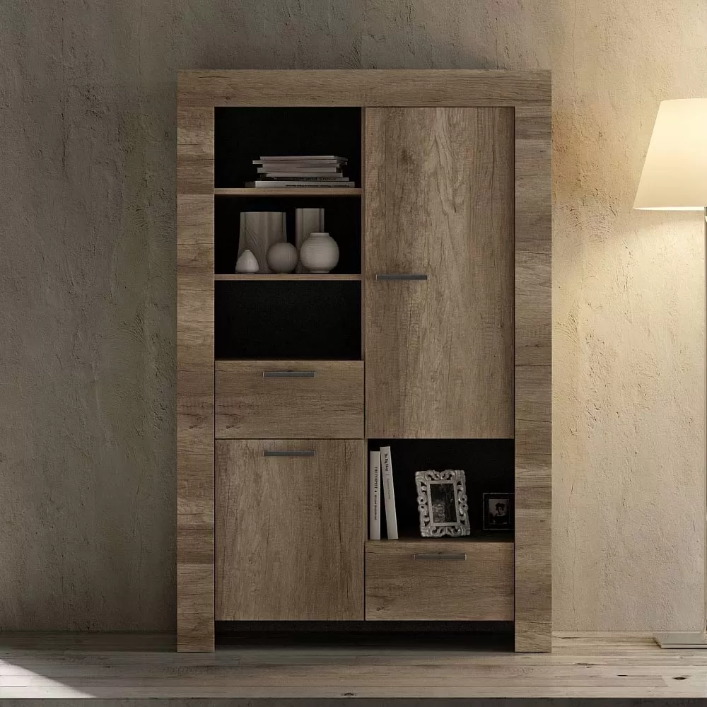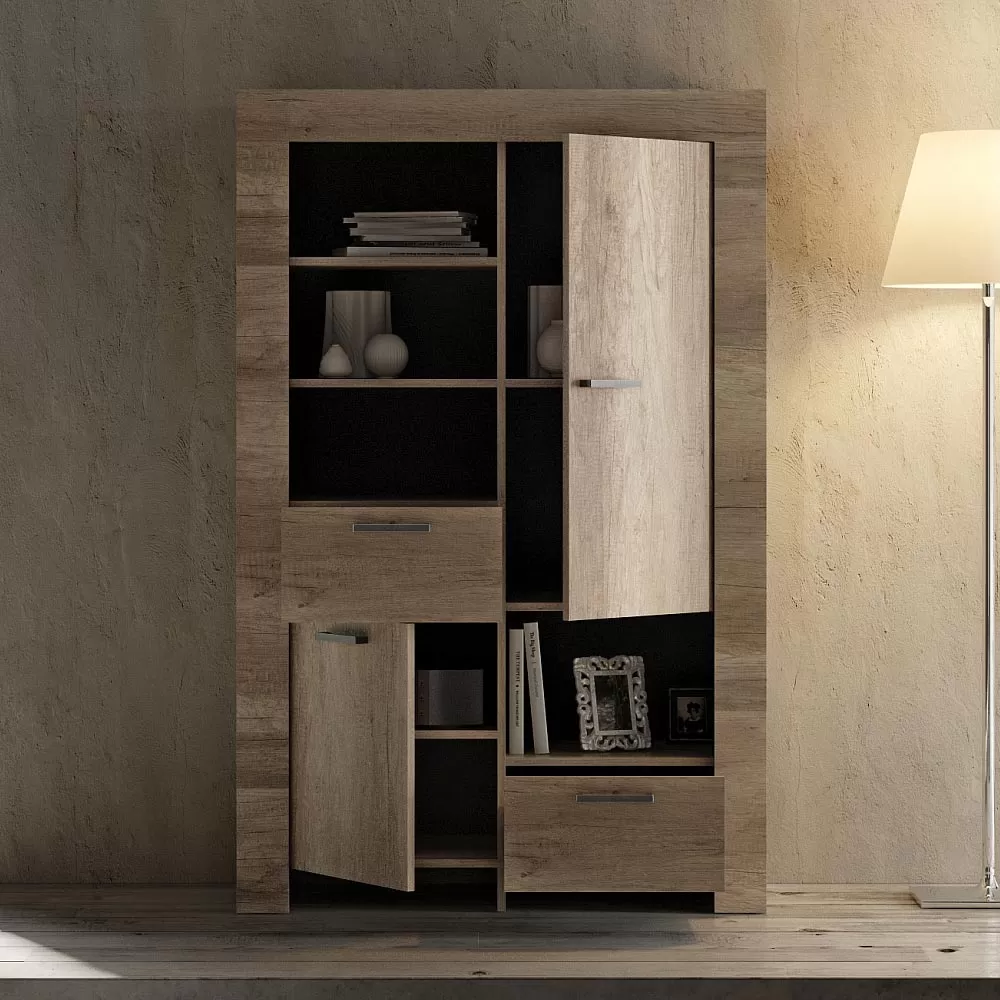 Living room sideboard made of agglomerate wood covered with light walnut finish melamine with 2 doors and 2 drawers with hinged opening complete with ABS handles in aged gray colour. Inside, the doors have a shelf each for a better division of space. The piece of furniture is also equipped with 4 open compartments, one of which is single and the other 3 divided by 2 shelves. A complement entirely produced in Italy characterized by an original and sober design thought for an optimal organization of the most varied objects inside the house thanks also to its excellent storage space .