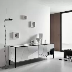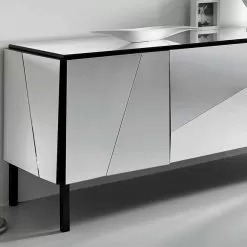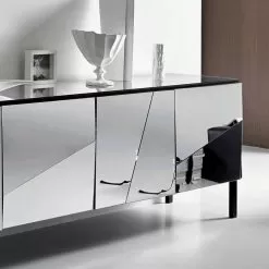 Made with a structure and feet in matt black lacquered wood, the mirror effect is total thanks to the glass cladding with concave and convex mirrors that makes it elegant and sophisticated, giving a touch of mastery and hospitality to the environment.