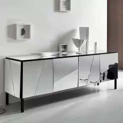 Made with a structure and feet in matt black lacquered wood, the mirror effect is total thanks to the glass cladding with concave and convex mirrors that makes it elegant and sophisticated, giving a touch of mastery and hospitality to the environment.
