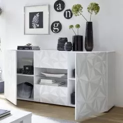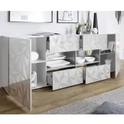 Living room sideboard entirely produced in Italy with melamine-coated particle board structure complete with doors and drawers without handles with hinged opening and decorated with elegant geometric screen printing . Â Inside the doors there are practical matching shelves . The sideboard also has 1 or 2 open compartments equipped with a glass shelf . A piece of furniture characterized by an essential and versatile design designed to organize and store the most varied objects of the house such as crockery, kitchen utensils or any other article, thus offering an optimal organization of spaces and at the same time a touch of refined style .