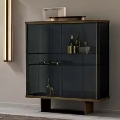 This low cabinet for the living room is made of smoked glass available in two different brushed finishes, bronze or black, for the profile of the sliding door, the handle and the feet of 20 cm height.