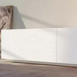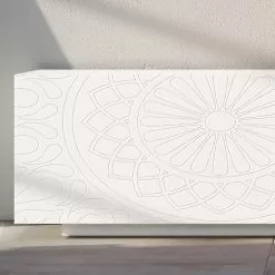 Modern sideboard with white matt lacquered MDF structure composed of 2 coplanar sliding doors  which guarantee great functionality and practicality and from the lacquered plinth which offers a lot of stability. This product is full of taste and design thanks to its elegant and refined finishes and the bas-relief decoration of the doors which makes them unique in their kind.  The various materials used for the construction offer great quality and resistance over time, giving the product that unique and unforgettable touch.