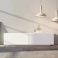 Modern sideboard with white matt lacquered MDF structure composed of 2 coplanar sliding doors  which guarantee great functionality and practicality and from the lacquered plinth which offers a lot of stability. This product is full of taste and design thanks to its elegant and refined finishes and the bas-relief decoration of the doors which makes them unique in their kind.  The various materials used for the construction offer great quality and resistance over time, giving the product that unique and unforgettable touch.