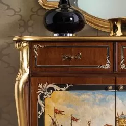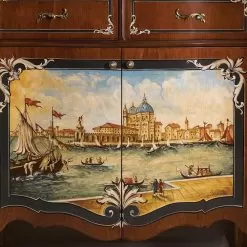 Sideboard for living room with a classic and refined style that shows a Venetian decoration on the front, a unique representation of the Venice Lagoon. Made of wood with gold details, it has two practical drawers and two doors. A unique and elegant complement, completely made in Italy by skilled master craftsmen , masters of art who finish each complement with wisdom and taste for elegance. The production is carried out using fine materials , and performing the work by hand with the utmost care and professionalism that distinguishes Made in Italy products.