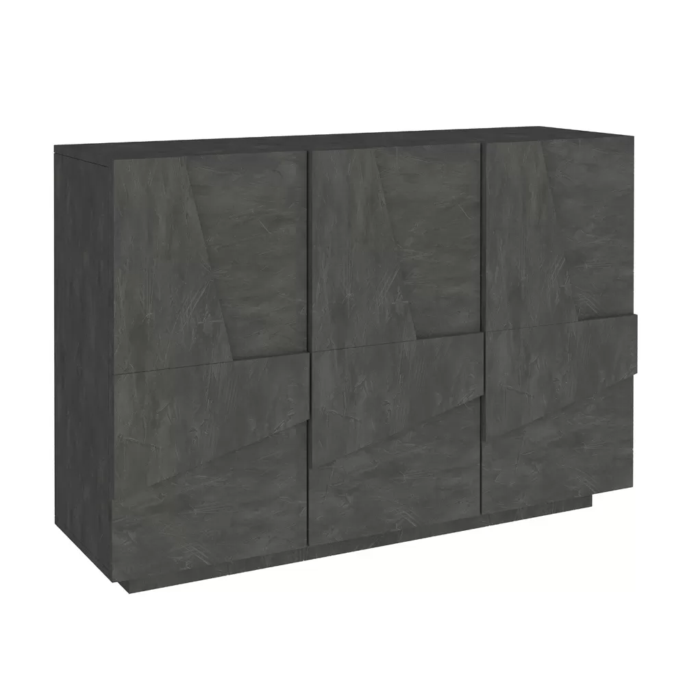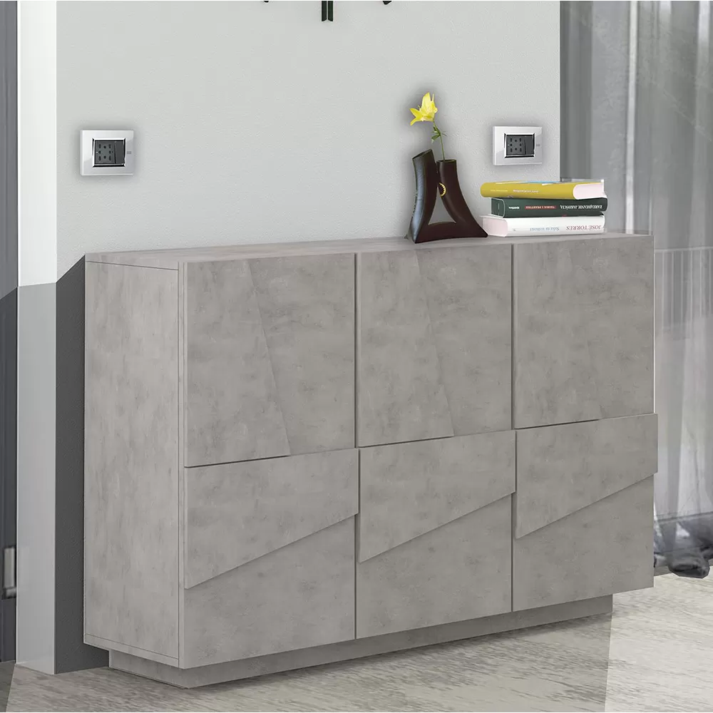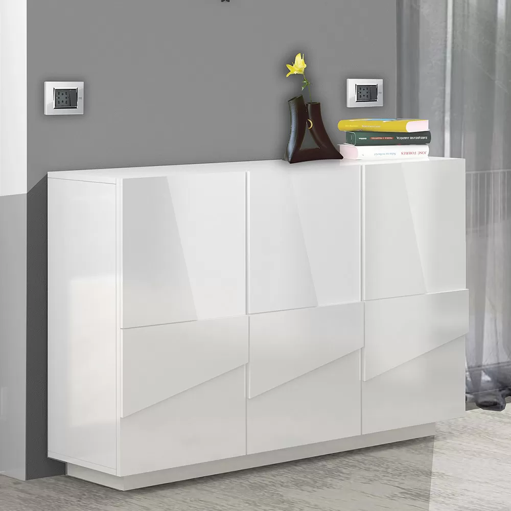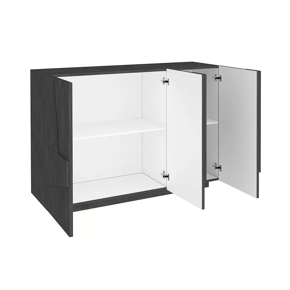 The sideboard is composed of 3 hinged doors made special by the geometric carving in relief on the surface, closing 4 storage compartments , which guarantee large storage space. It is made of melamine and 100% Made in Italy . This product lends itself to completing the decor of any living area thanks to its simple and elegant finishes that give the room a unique and unforgettable touch. The material used guarantees quality and resistance even over time.