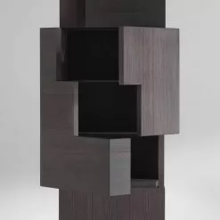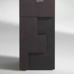 Modern design storage unit made of brushed thermo treated larch wood. It is provided with 3 compartments and 1 dyed thermo treated and brushed larch wood drawer.
