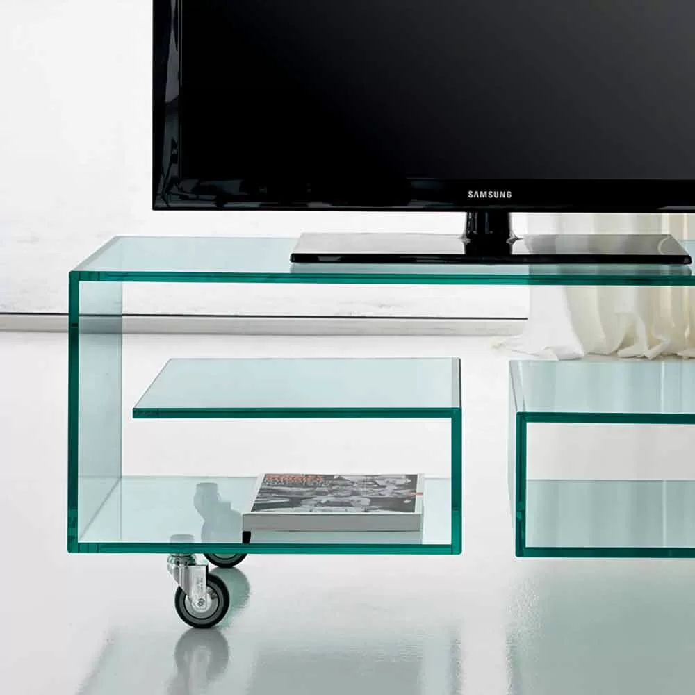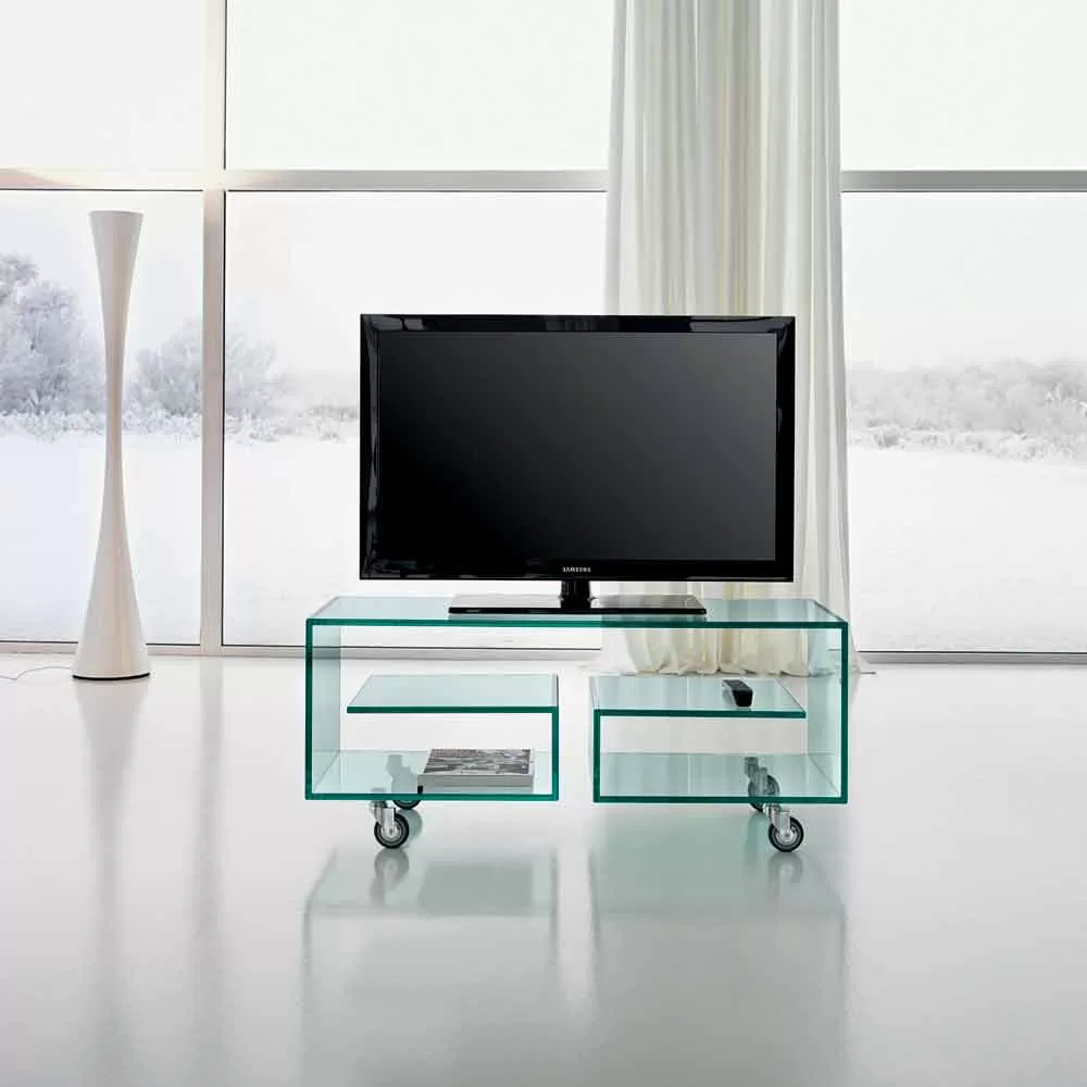 Transparent glass TV stand and wheels, luxury made in Italy.