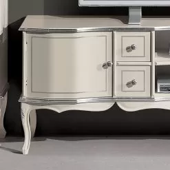 Classic style TV stand for living room with 2 doors, 4 drawers and 2 compartments. All the style and craftsmanship that characterize the workmanship emerge in this sumptuous piece of furniture made with precious white wood with silver details , a refined complement capable of embellishing the environment in which it is placed. Completely made in Italy and handcrafted by skilled master craftsmen , finished with wisdom and taste for elegance. The production is carried out using fine materials , and performing the work by hand with the utmost care and professionalism that distinguishes Made in Italy products.