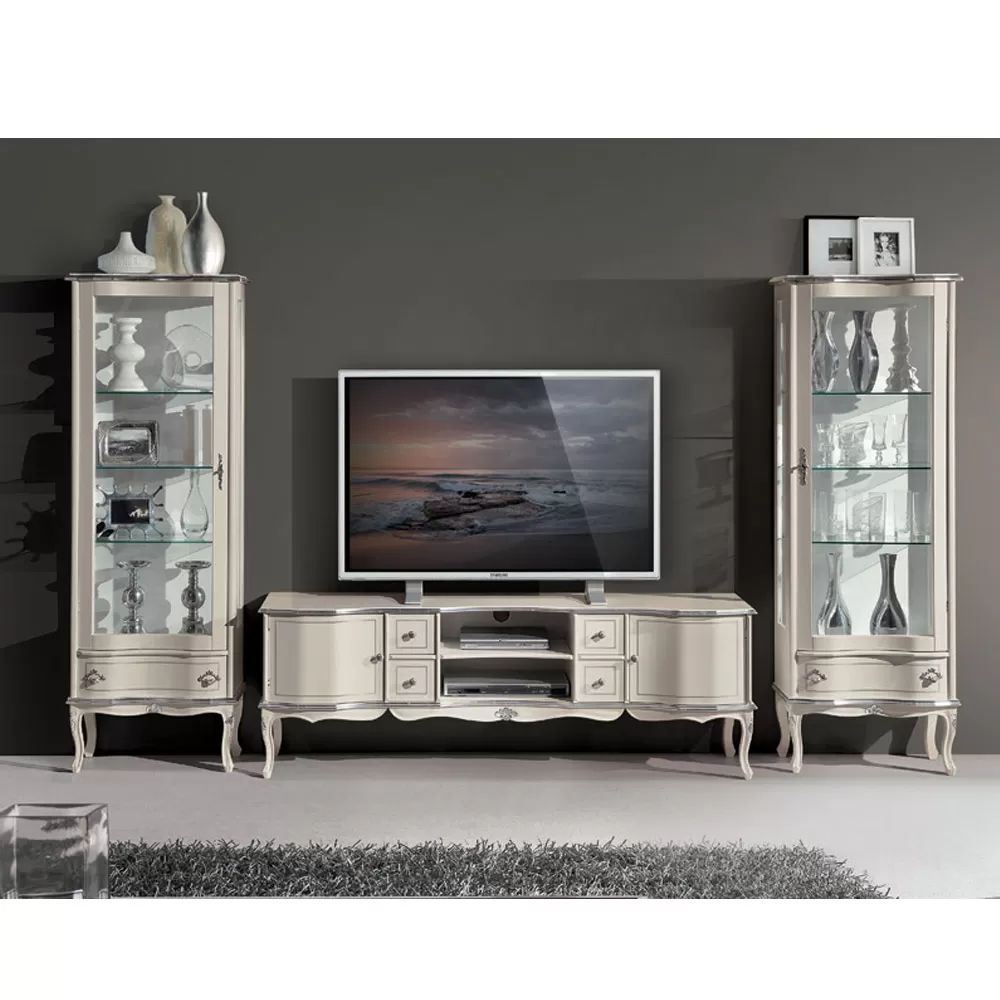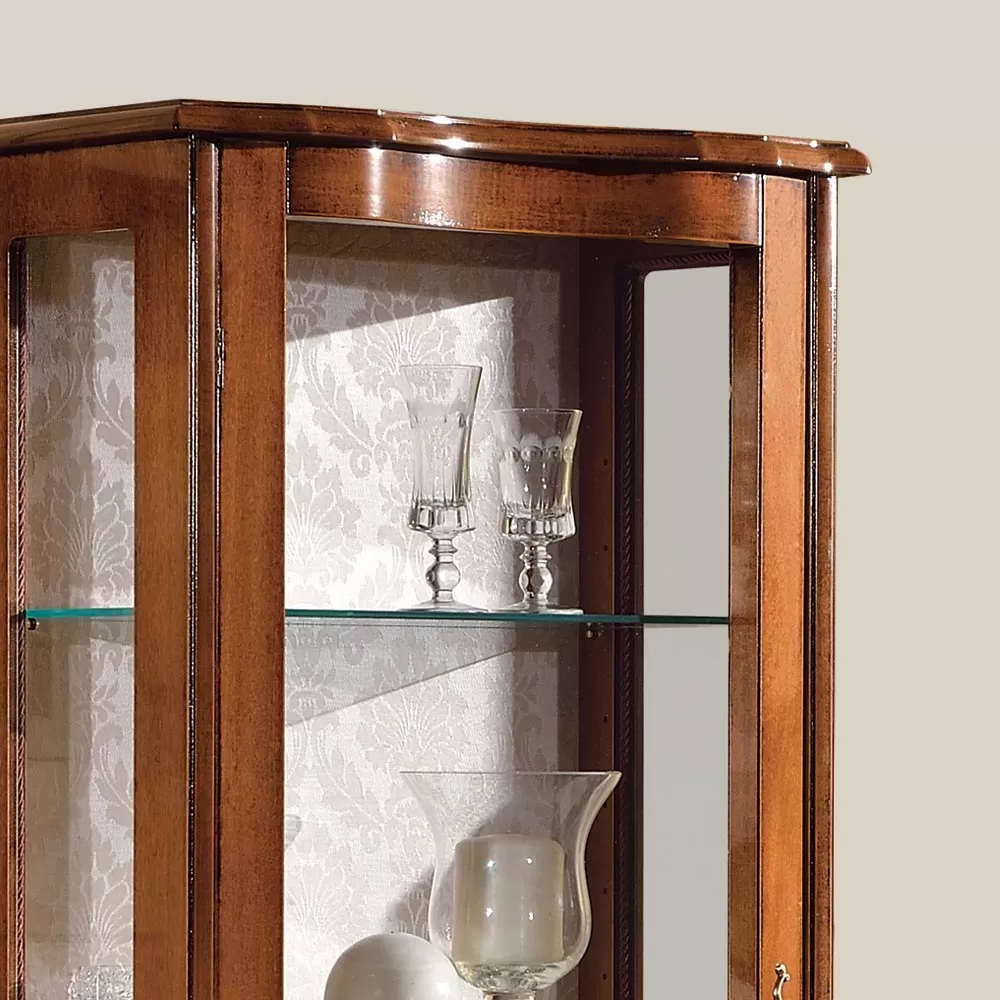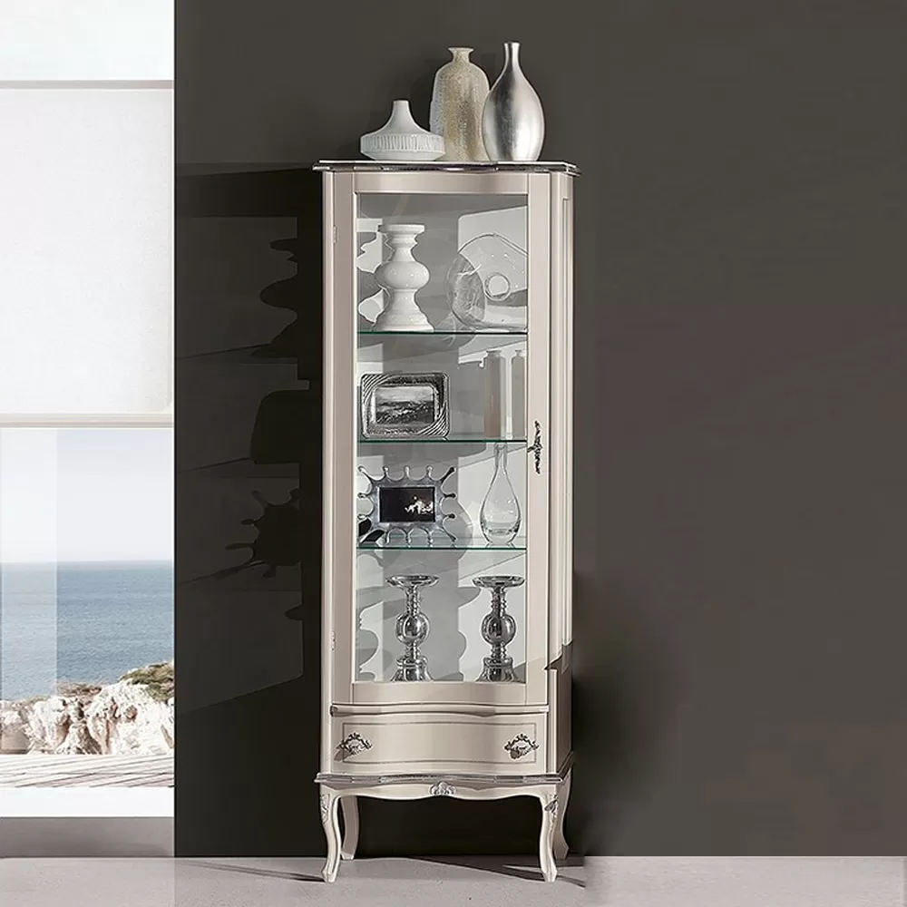 Living room display cabinet made of precious wood available in walnut finishes with golden inlays or white with silver details , with door and practical drawer. Elegant and timeless, this classic style display cabinet is ideal for creating impressive settings through the evocation of atmospheres of yesteryear. Completely made in Italy by skilled master craftsmen , finished with wisdom and taste for elegance. The production is carried out using fine materials , and performing the work by hand with the utmost care and professionalism that distinguishes Made in Italy products.