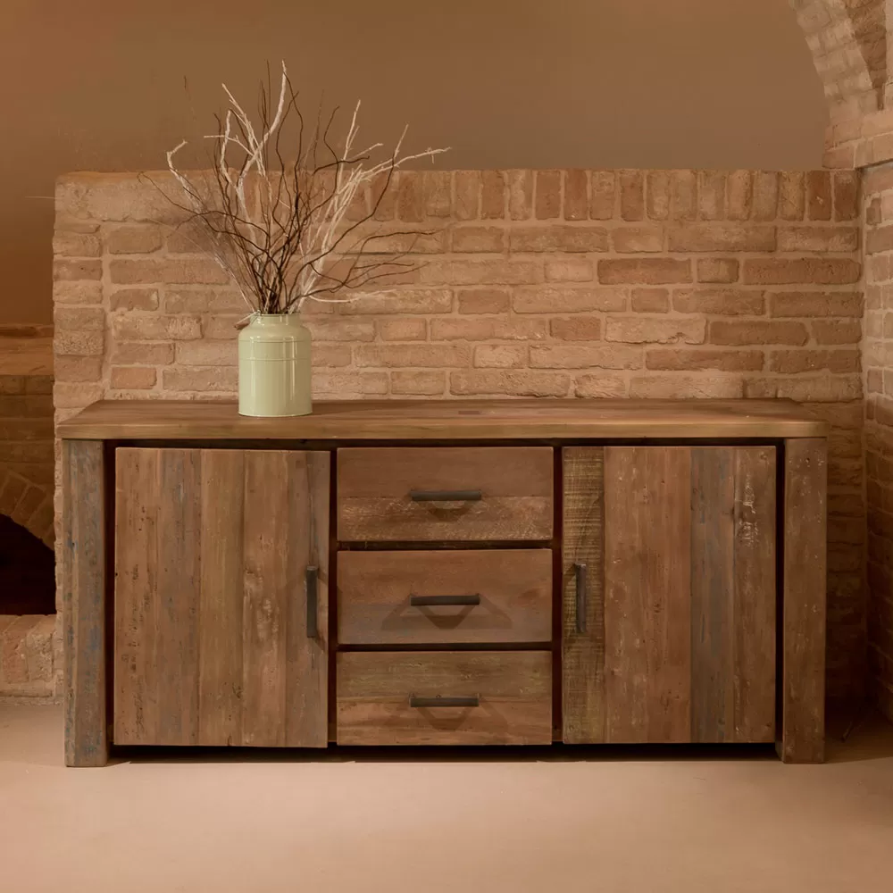 Indoor sideboard made of recycled wood with Pandora finish with 2 doors and 3 central drawers .