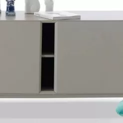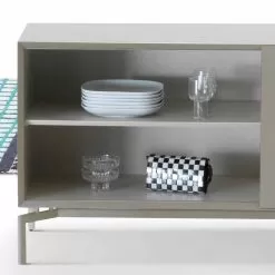 Sideboard in matte lacquered dove grey mdf, with grey warm lacquered open compartment.