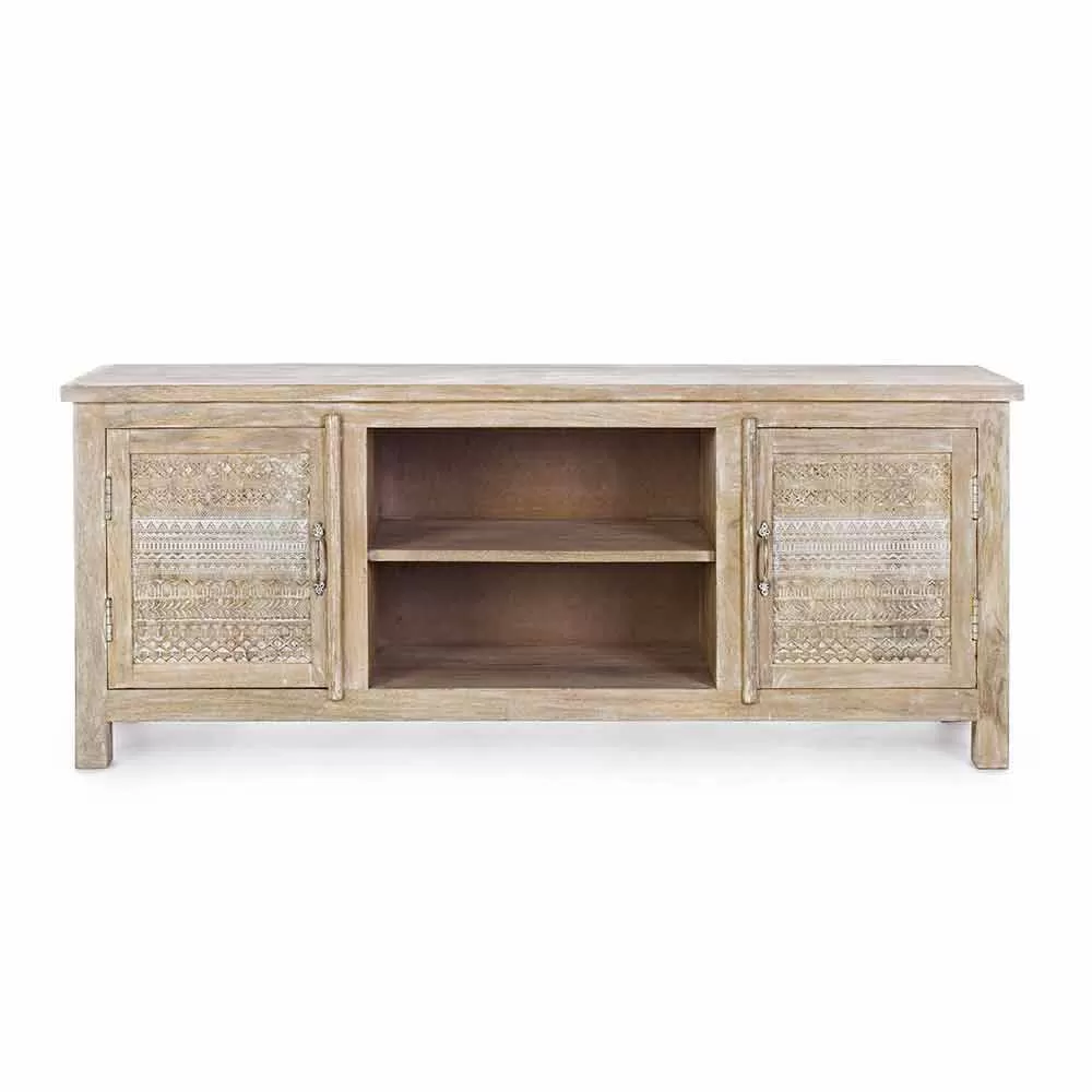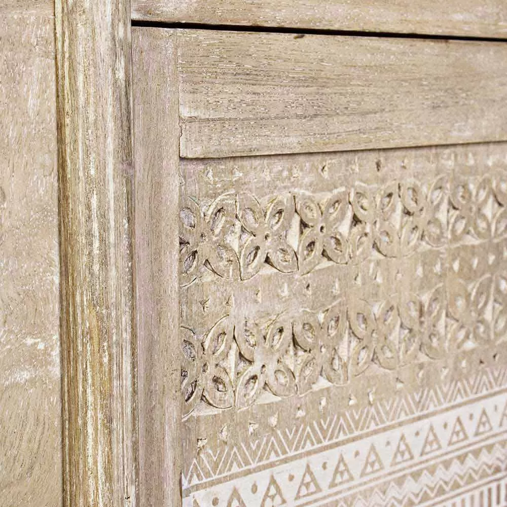 Low cabinet with structure in mango wood with handmade decorations.