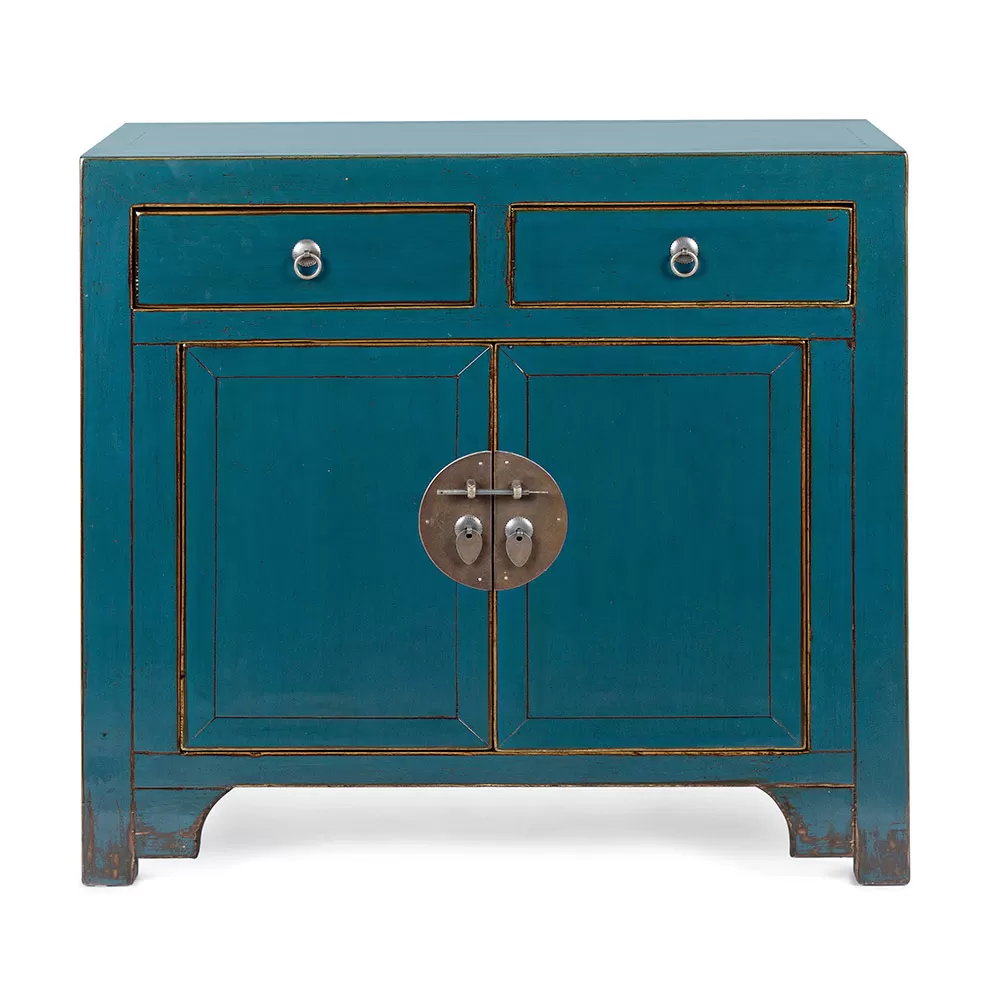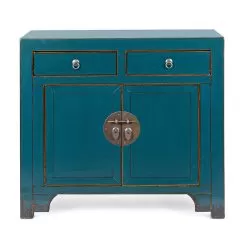 Low cabinet in blue elm wood with 2 doors and 2 drawers, vintage style design.