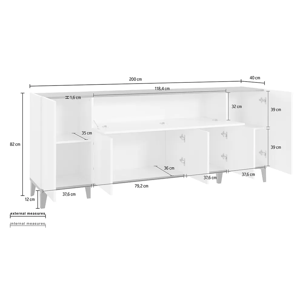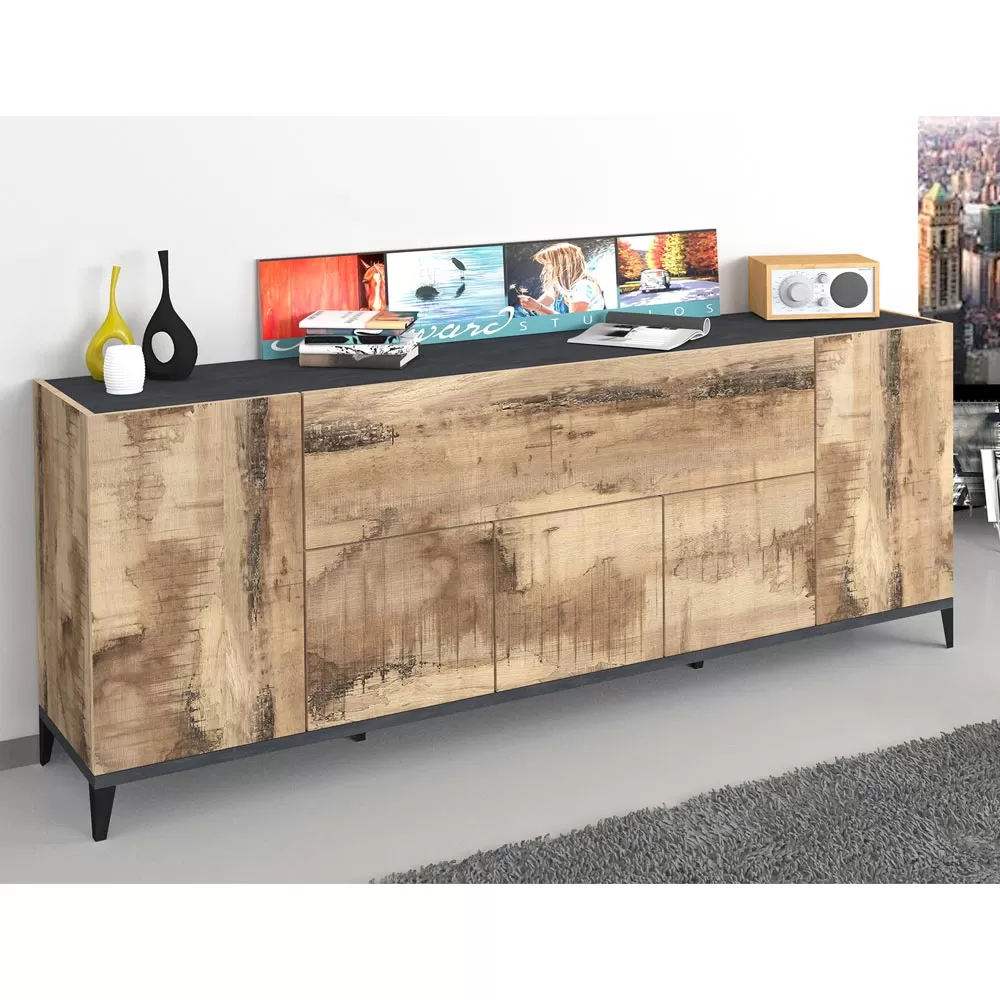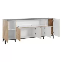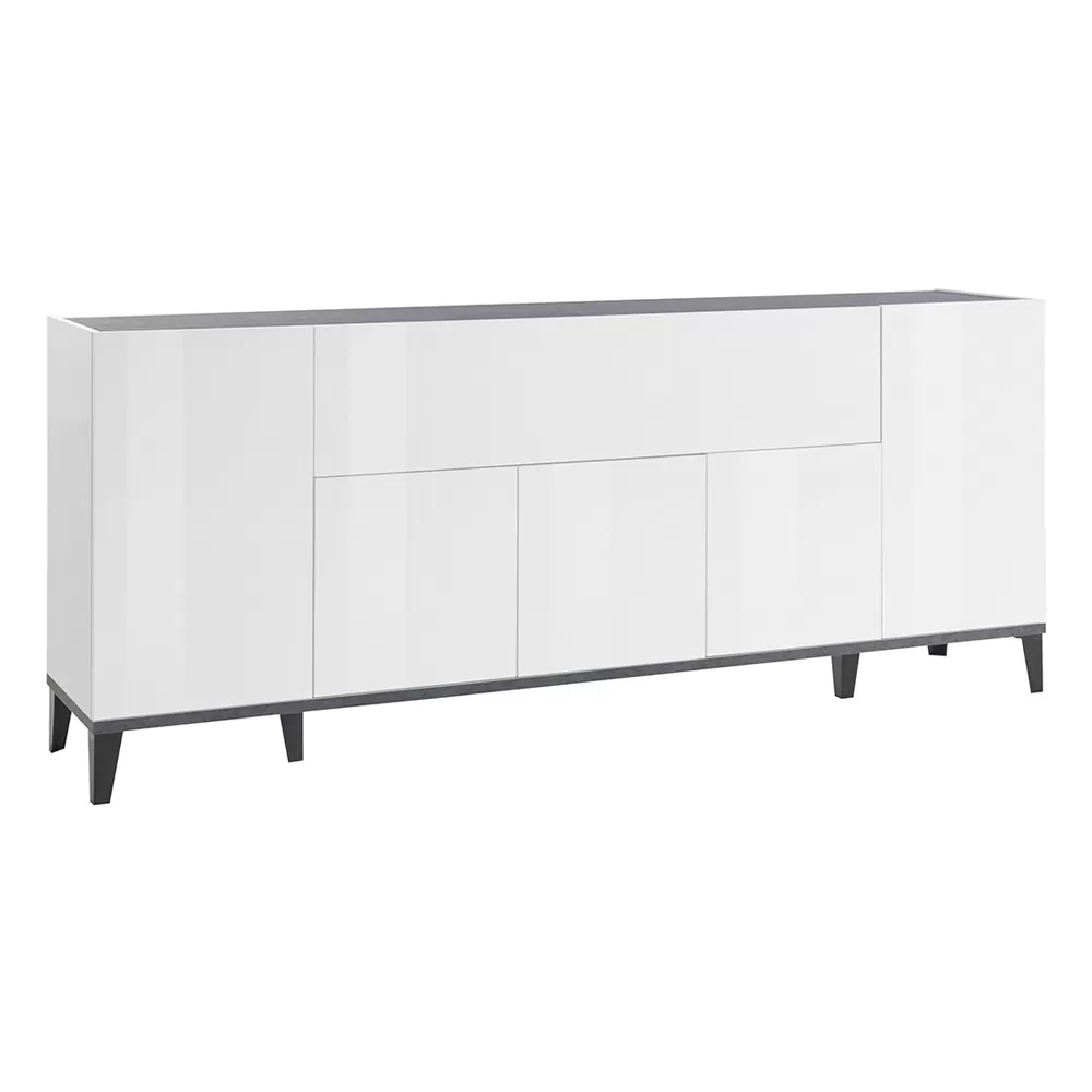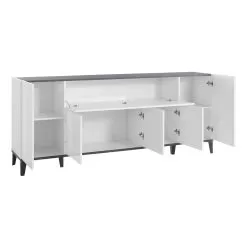 Living room or kitchen sideboard made in Italy in melamine wood with simple but elegant tones, complete with 5 doors with hinged opening , 1 external central compartment with flap opening and 6 internal compartments containing practical shelves that make the product roomy and functional . Ideal to be placed in the corridor or in the entrance area, the small size of this sideboard allows you to keep order and save space , fitting perfectly into any environment and creating perfect harmony with the surrounding elements.