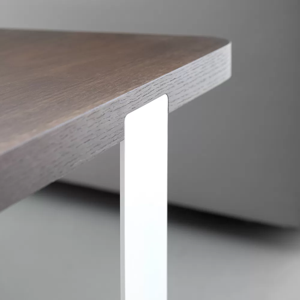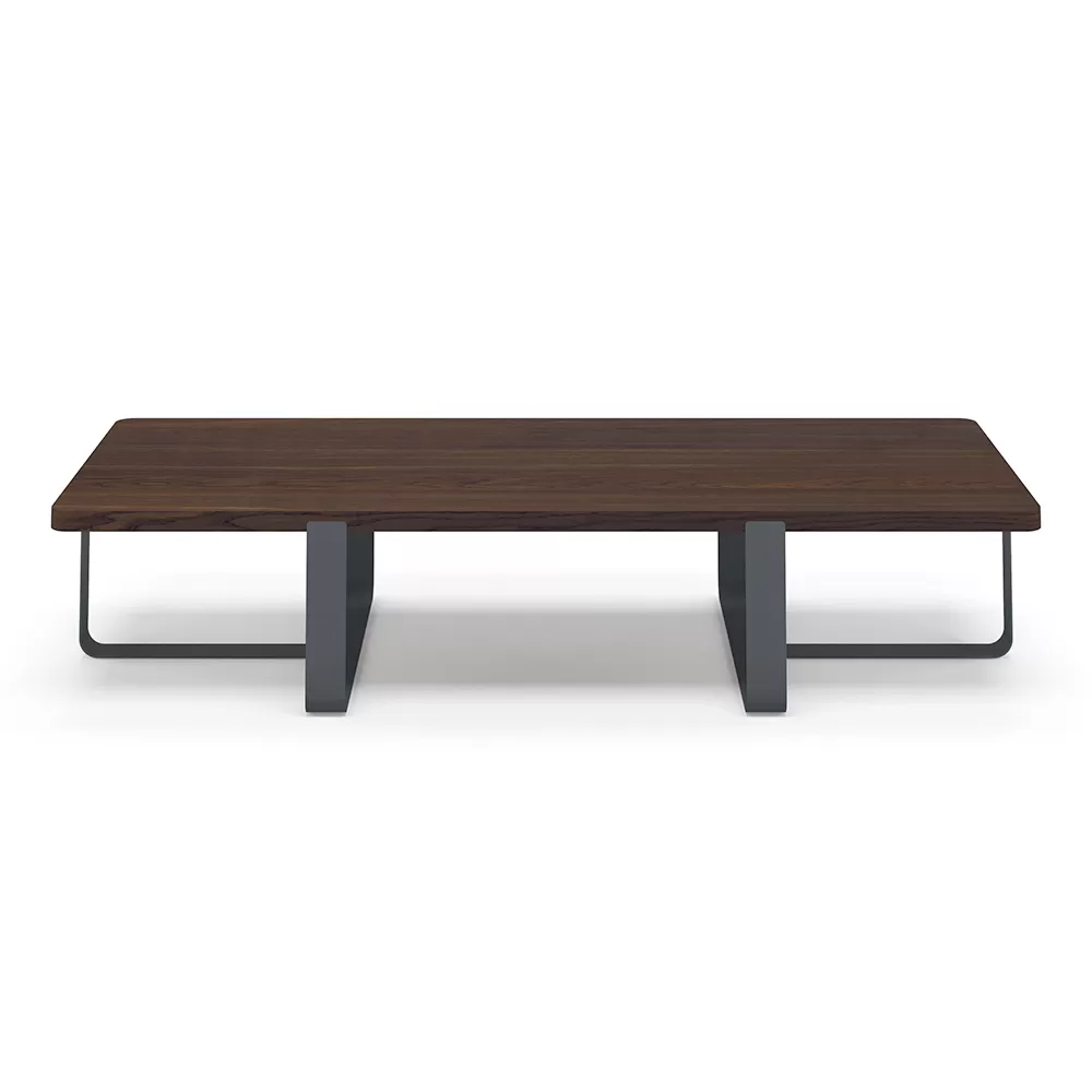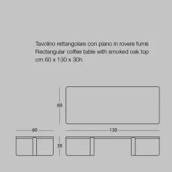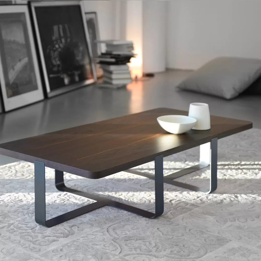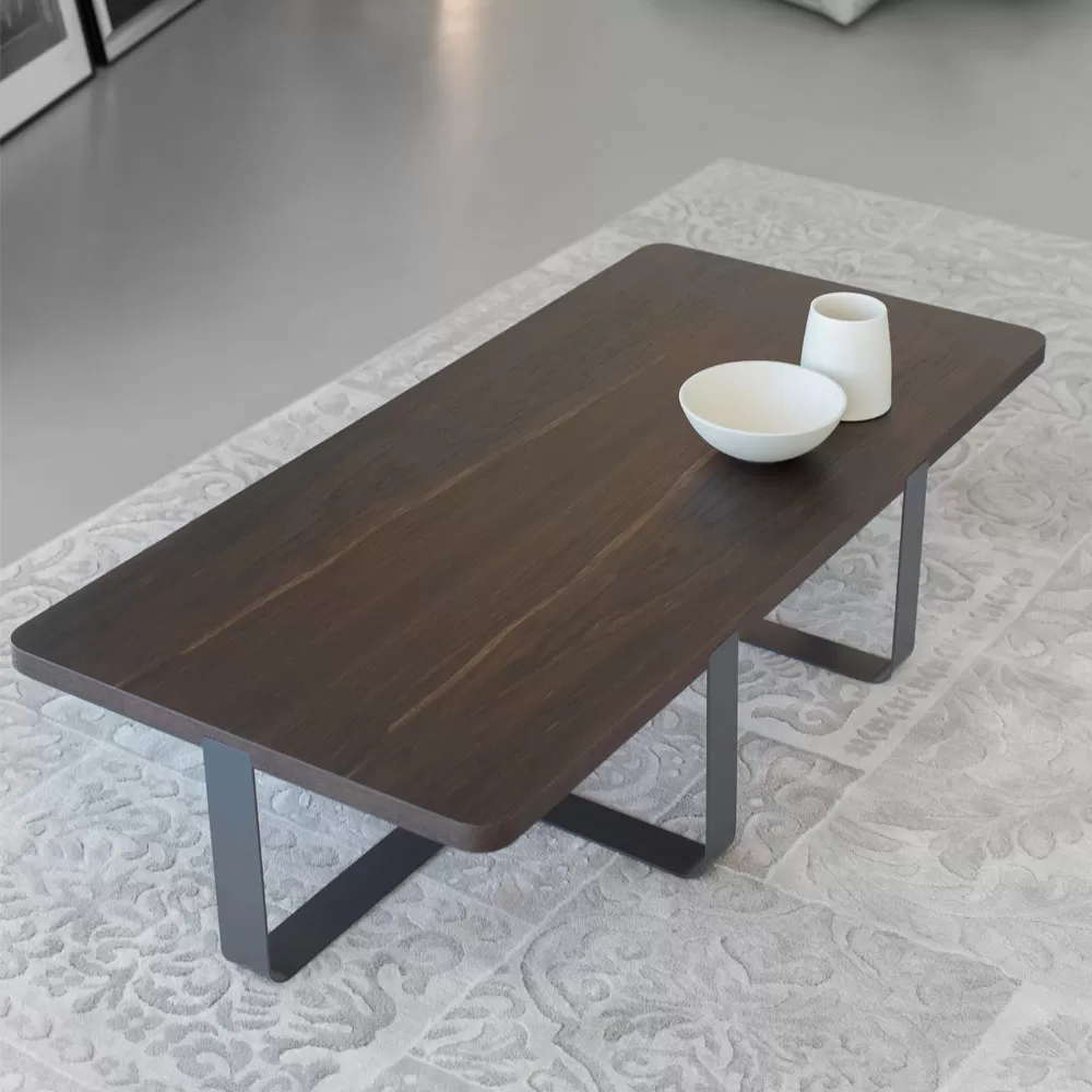 This coffee table for the living room is characterized by its unique and luxurious design, with the top in smoked stained oak veneer and a metal broadband base available in various finishes.