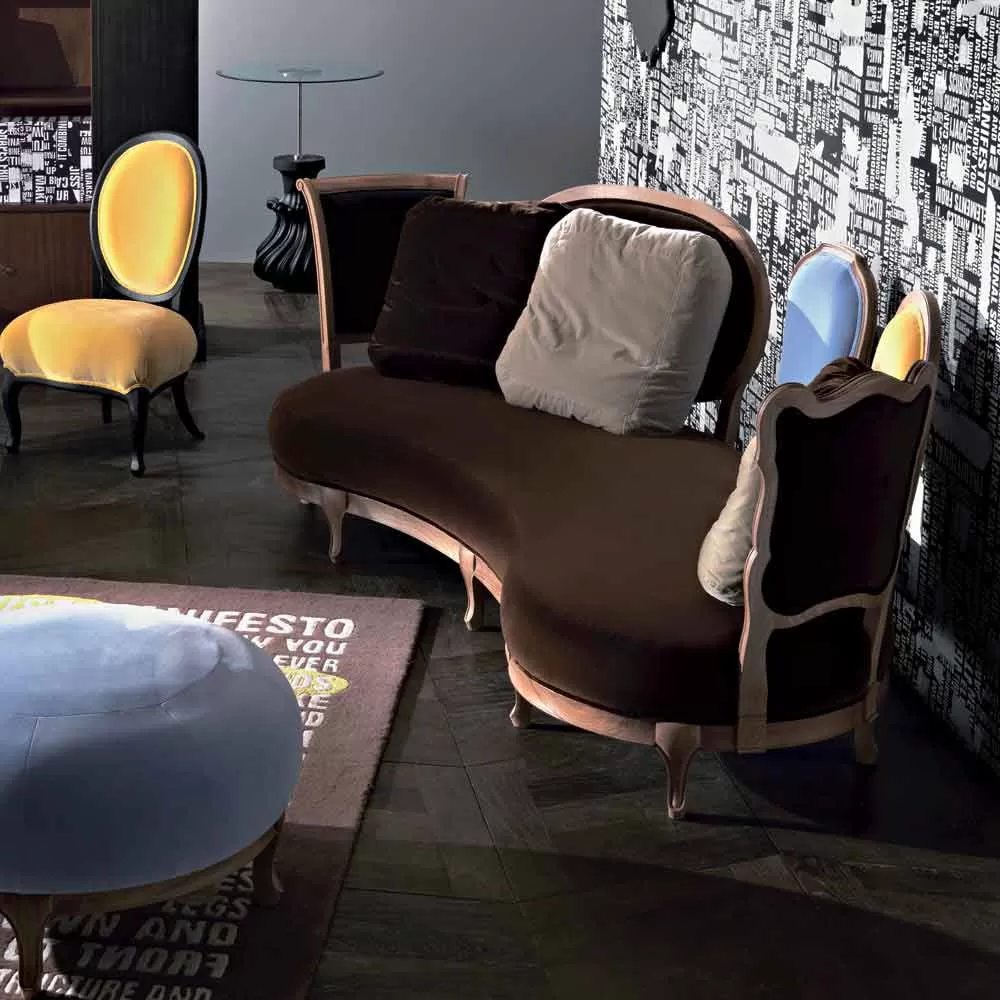 A unique and extravagant style characterizes the Manno sofa. 5 different backrests for shapes and colors contribute to give dynamism and personality to the sofa. The structure is made of hand-carved solid walnut wood. Backrests and seat are upholstered, with fabric covering.