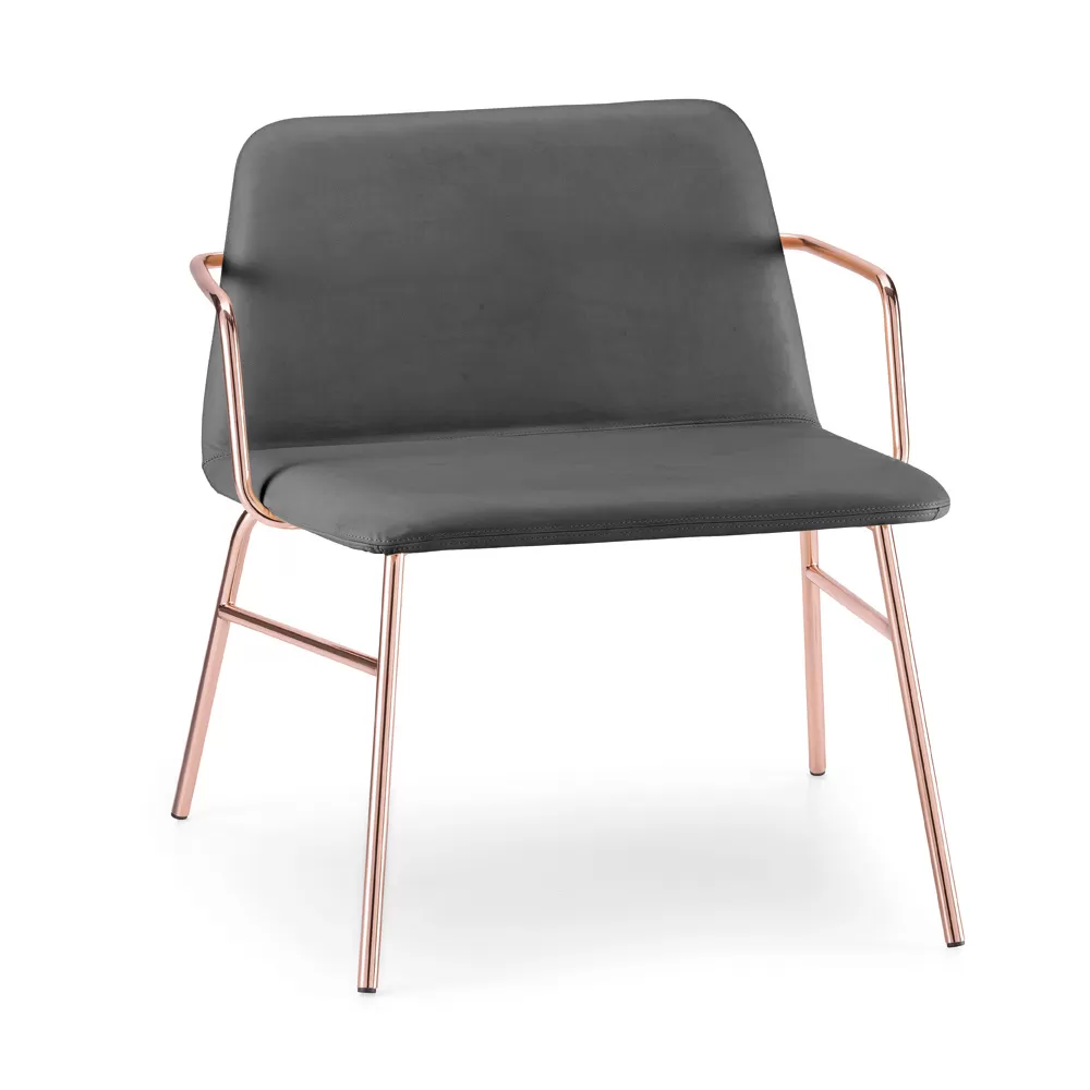 Modern living room armchair made in Italy with copper finish painted metal structure and upholstered shell covered in velvet or leather . Solid, sturdy and with a refined style, it combines all the fundamental characteristics of the perfect armchair, ensuring unparalleled comfort and a welcoming seat that offers wonderful moments dedicated to relaxation. However, its excellent functionality does not exclude the aesthetic side, capable of creating dreamy atmospheres and a unique beauty making it a perfect solution for living areas with a modern taste. The combination of the copper finish and the timeless elegance of velvet and leather gives life to an extremely fascinating and classy design object that characterizes the aesthetics of the entire room, revolutionizing its look thanks to an original touch .