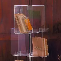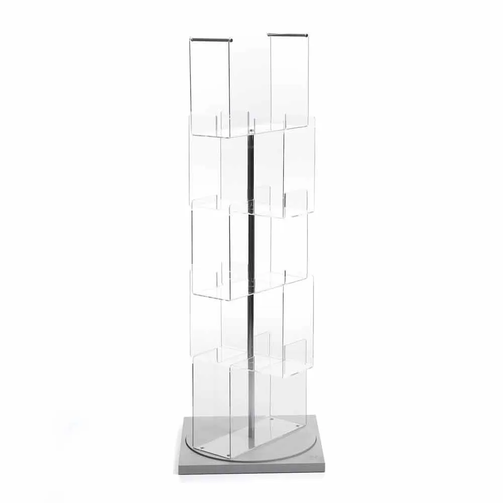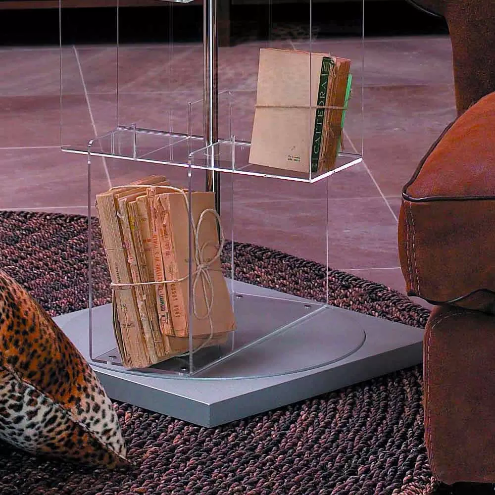 Multi-purpose container with swivel base, for books, magazine racks, CDs and DVDs. Made of transparent methacrylate with base in grey lacquered mdf.
