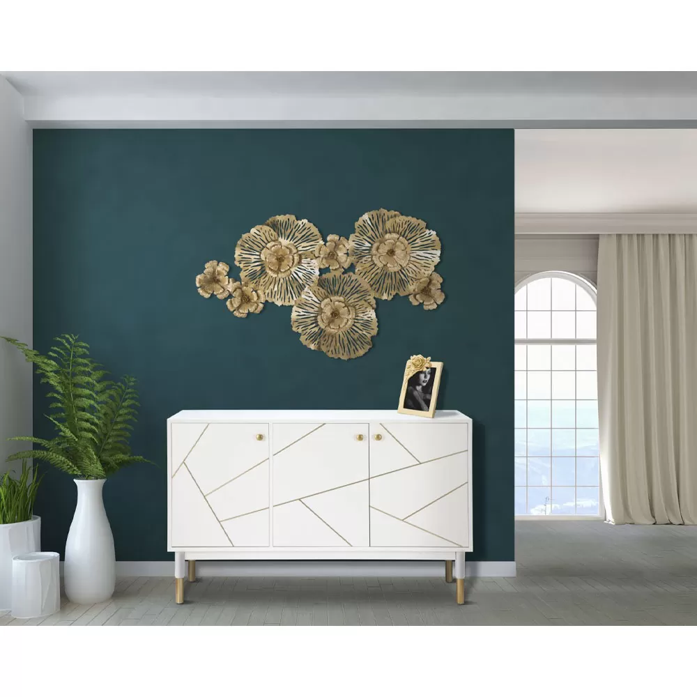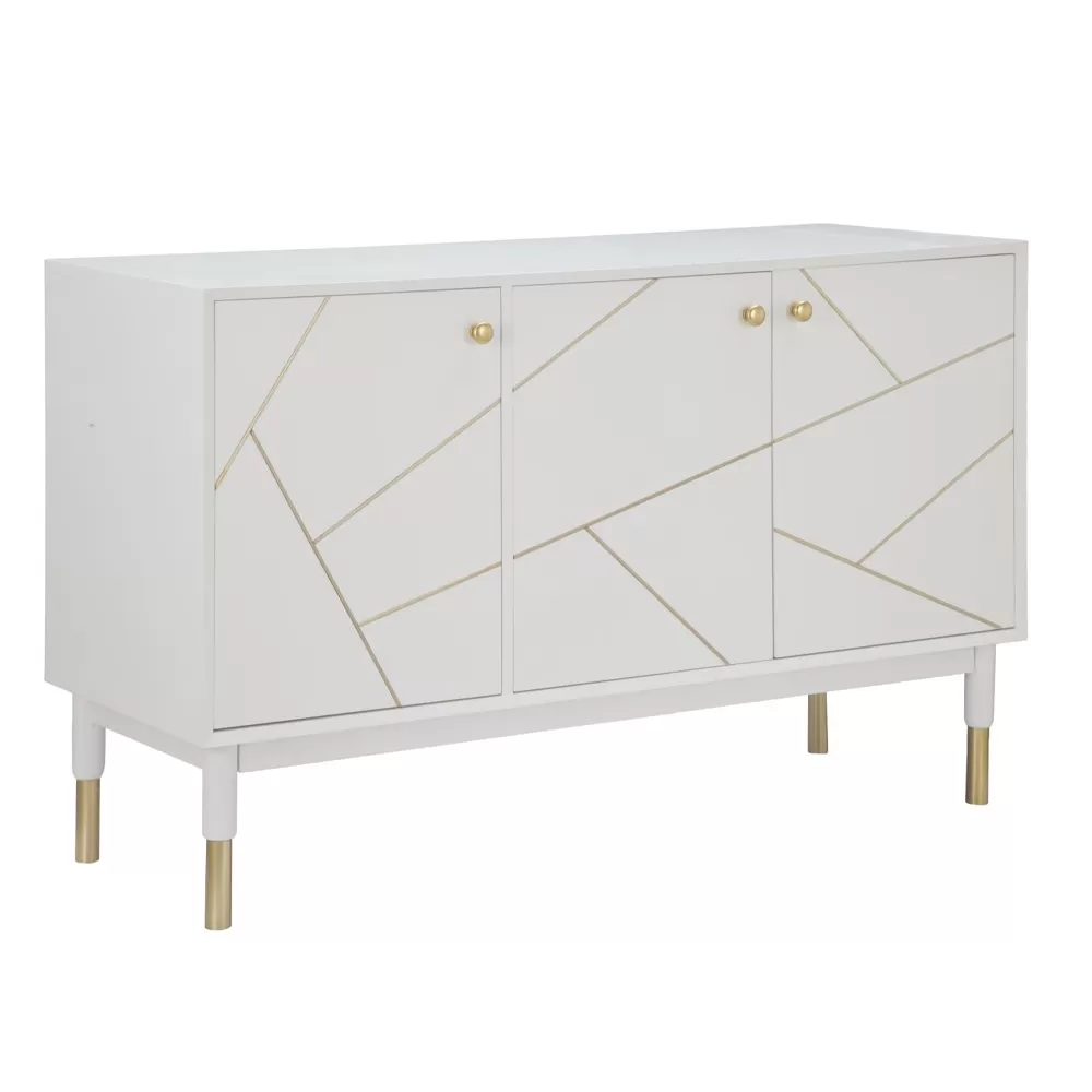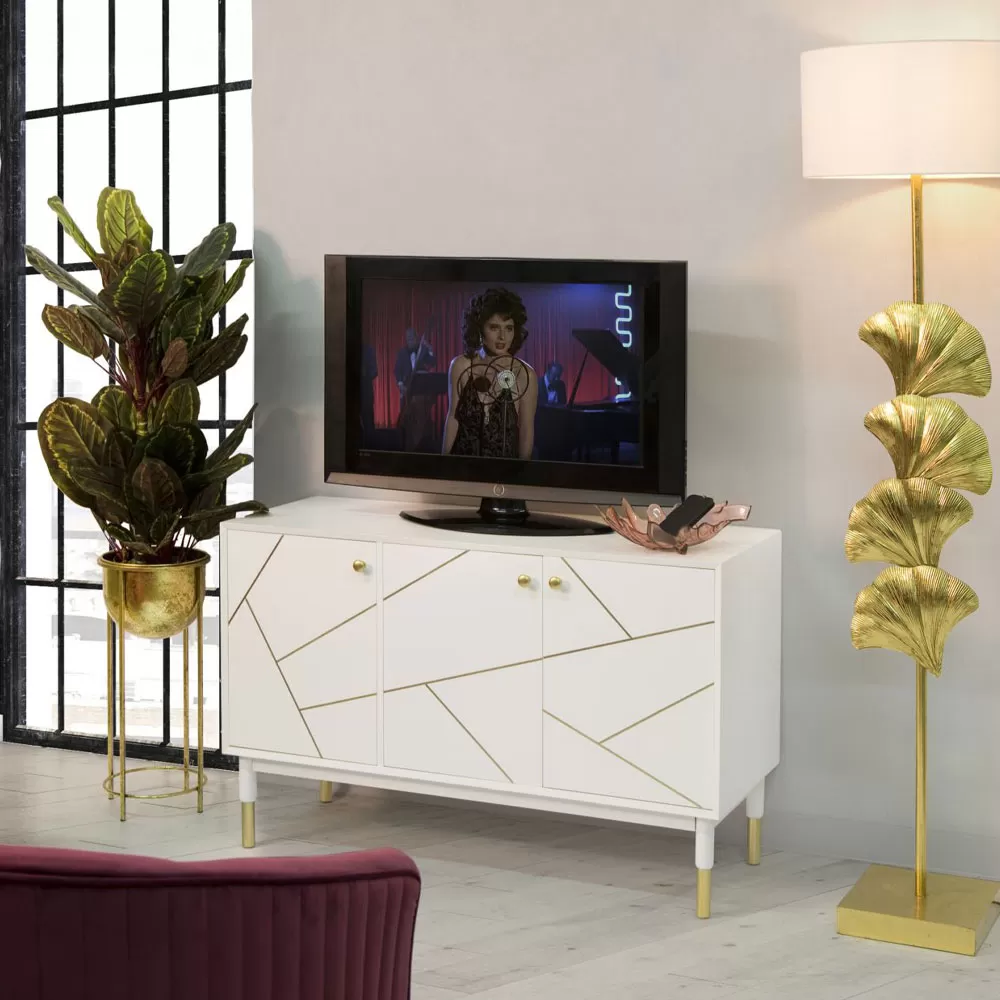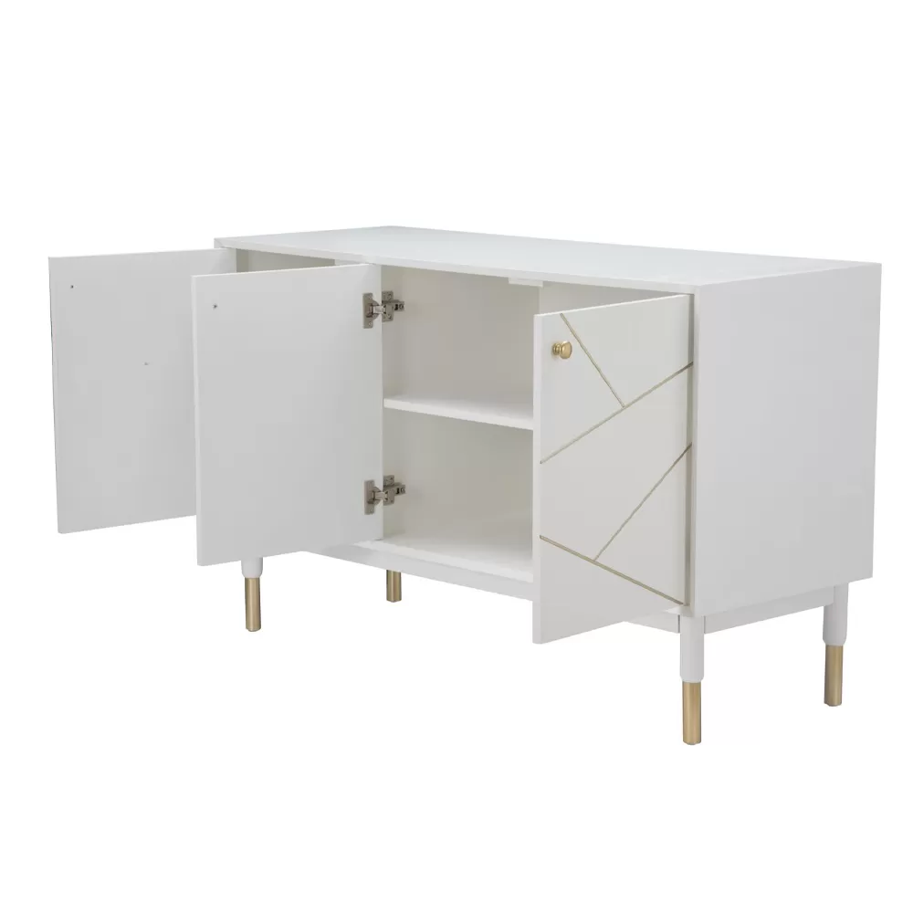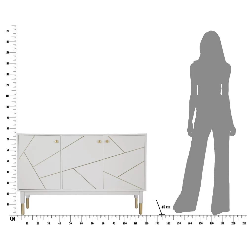 3-door sideboard in white mdf enriched with golden finish decorations.