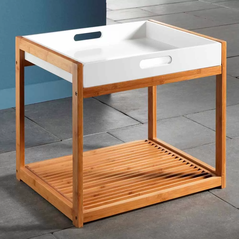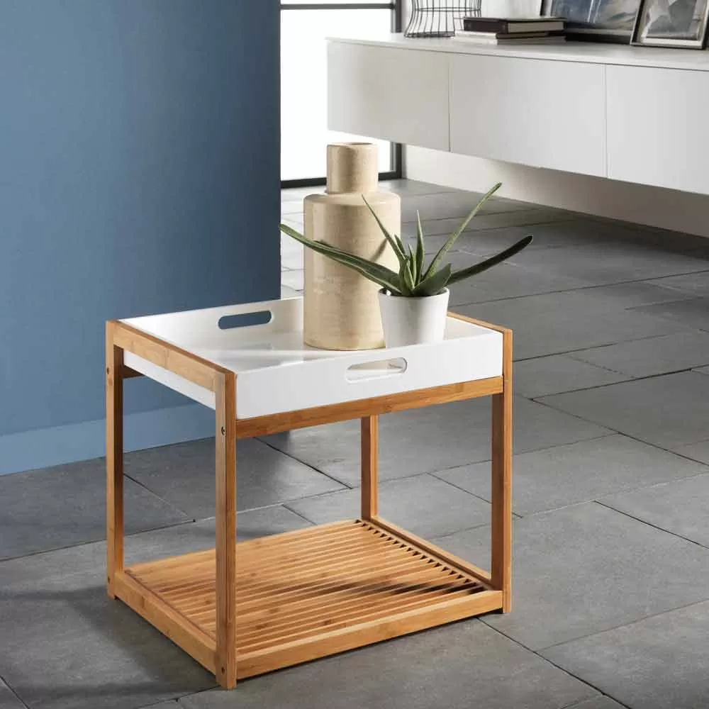 This coffee table is characterized by an elegant and refined design given by the combination of materials and colors used. Its structure is made of painted bamboo wood and has a removable matt white lacquered mdf top , which can easily become a practical and functional tray ideal for carrying drinks or simply as a display surface for decorative objects inside the living room.