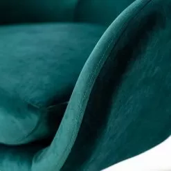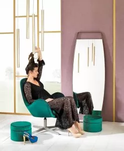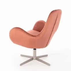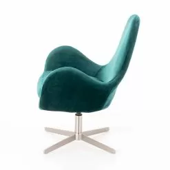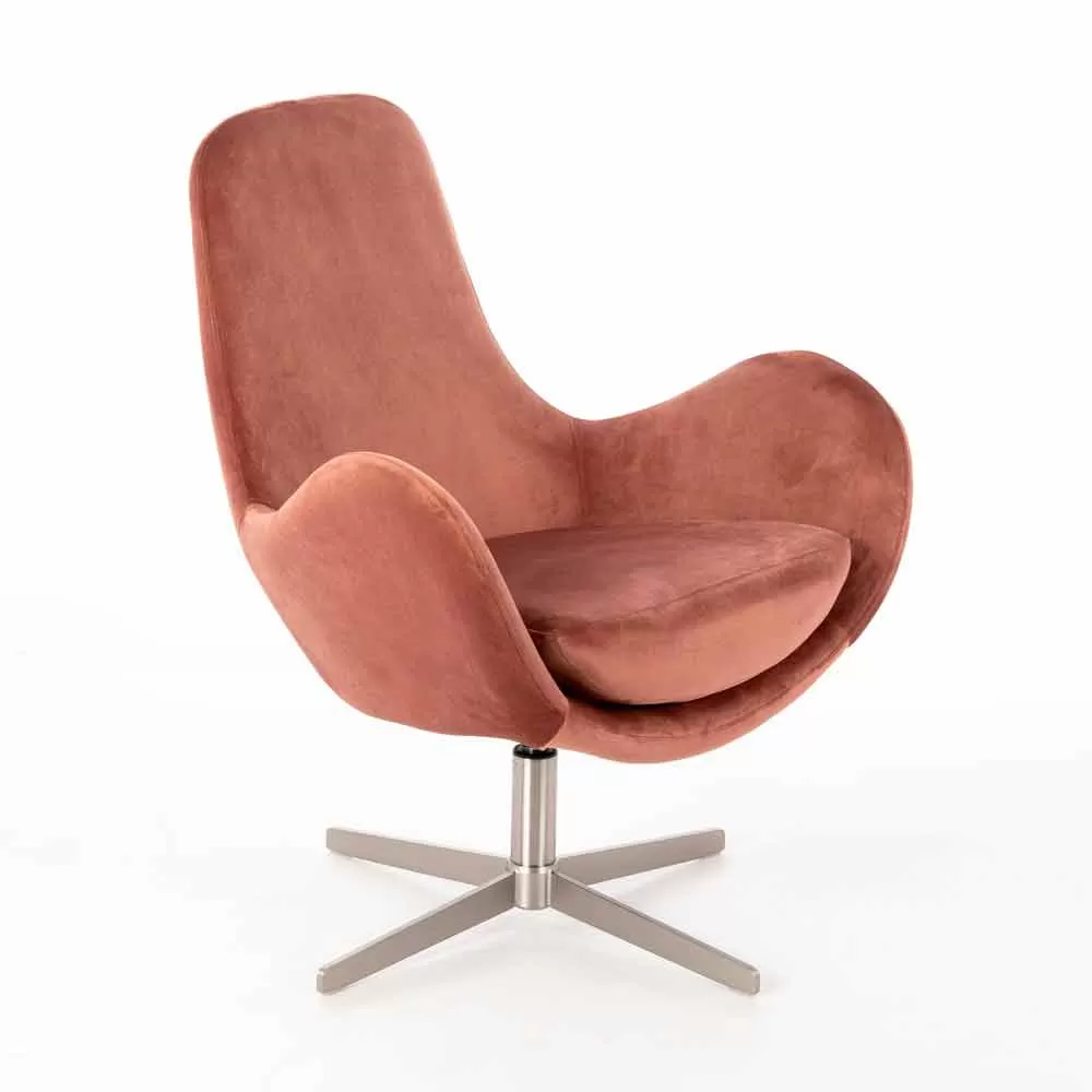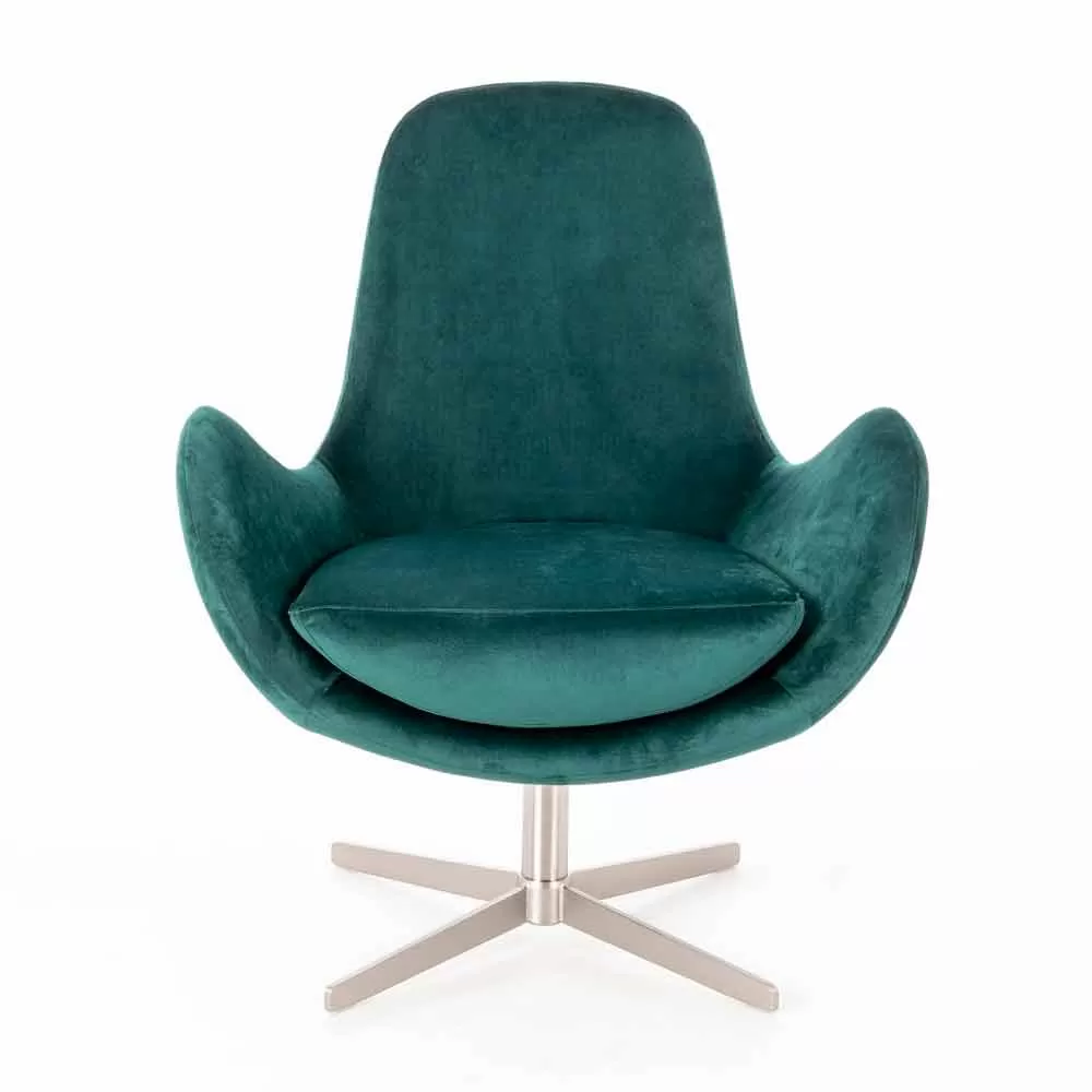 Swivel and padded modern living room armchair with velvet seat and chrome metal base.