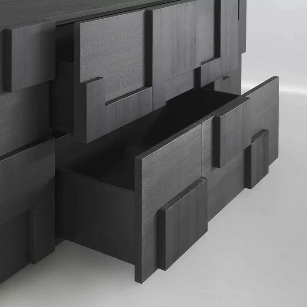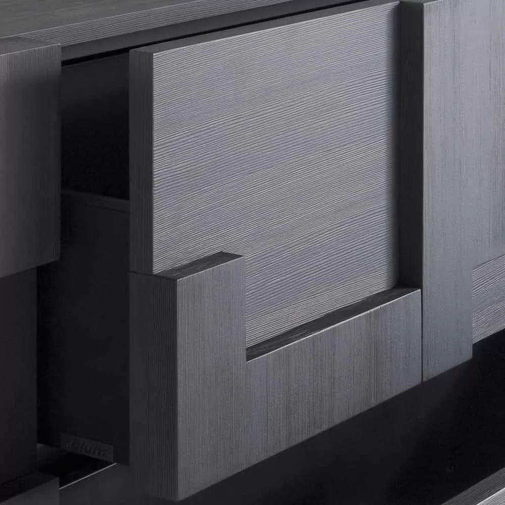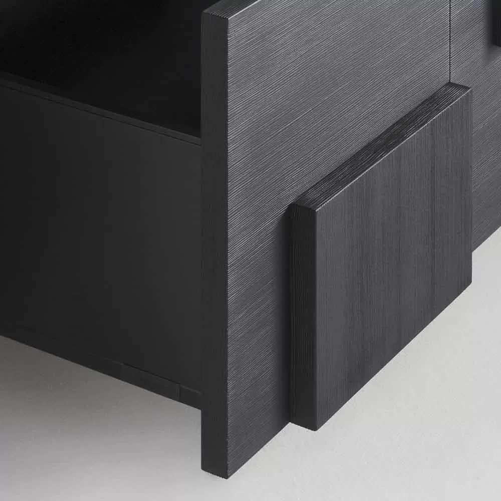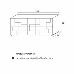 Living room storage unit made of brushed thermo treated larch wood. It is provided with n°4 compartments ( n°2 doors and n°2 drawers). The inner shelves are made of lacquered MDF.Â