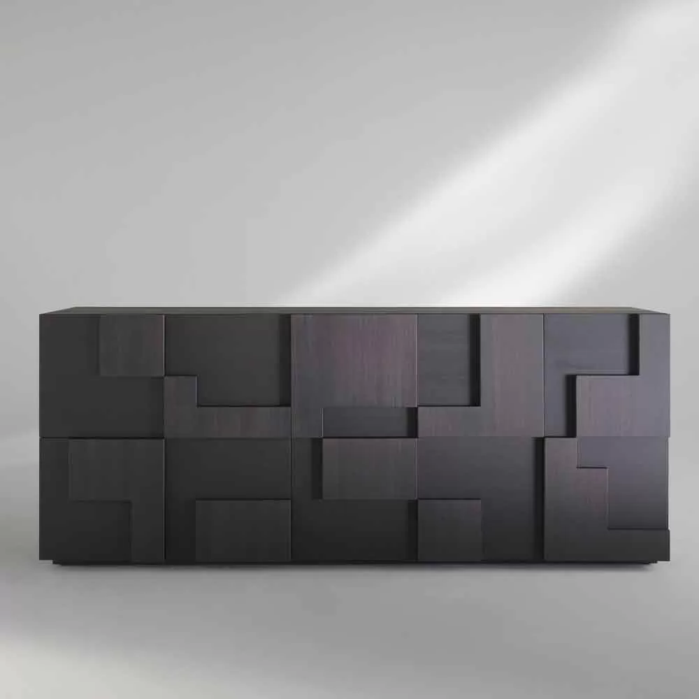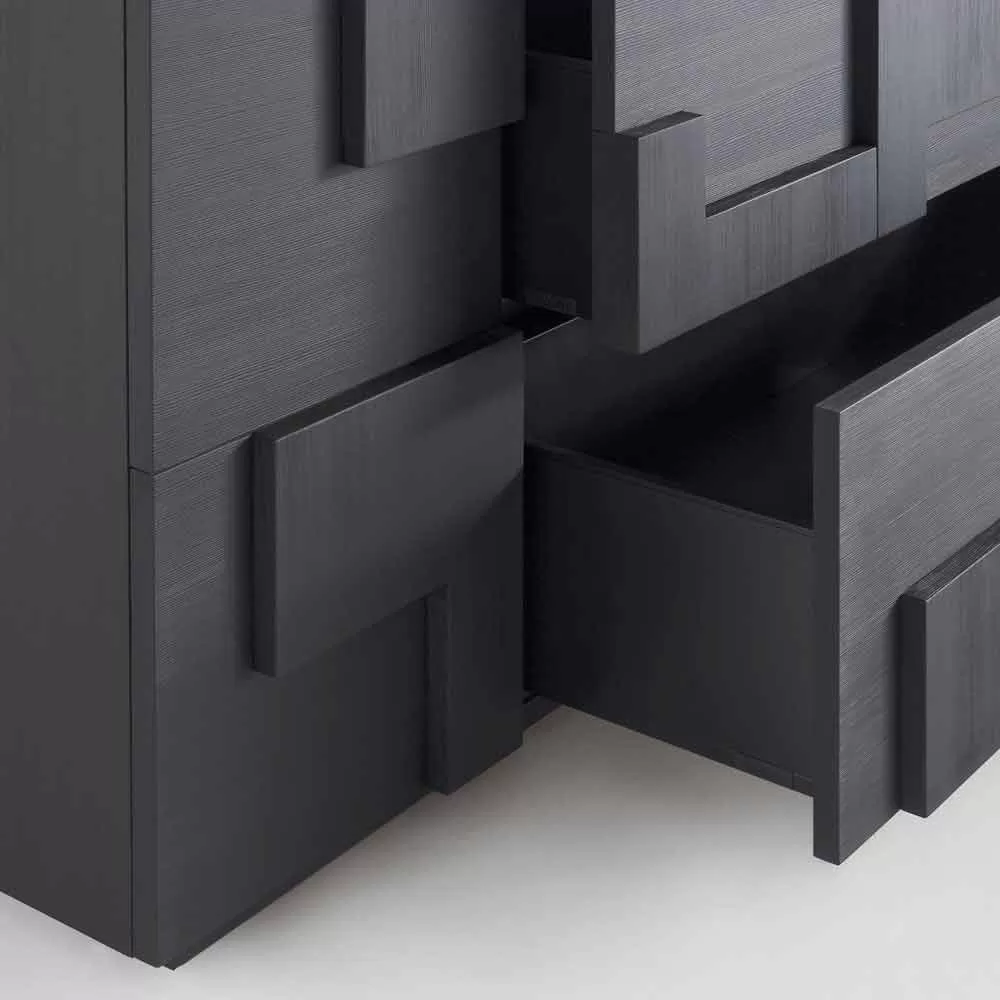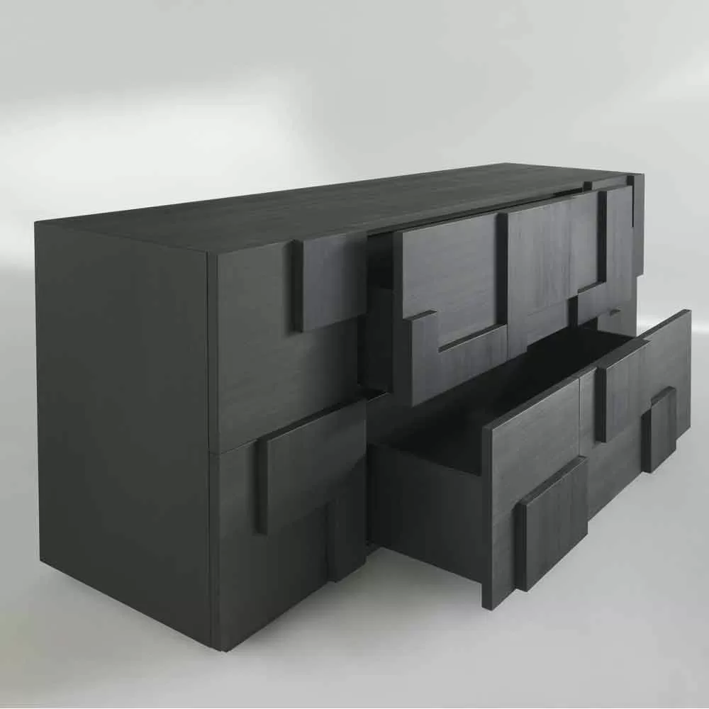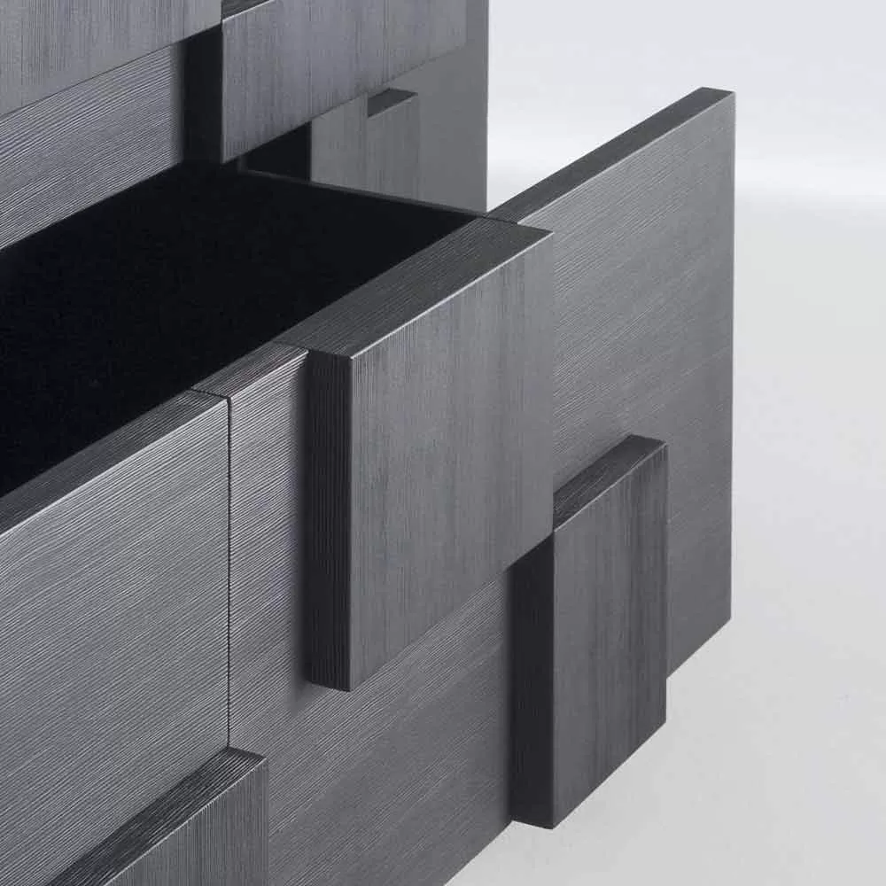 Living room storage unit made of brushed thermo treated larch wood. It is provided with n°4 compartments ( n°2 doors and n°2 drawers). The inner shelves are made of lacquered MDF.Â