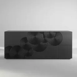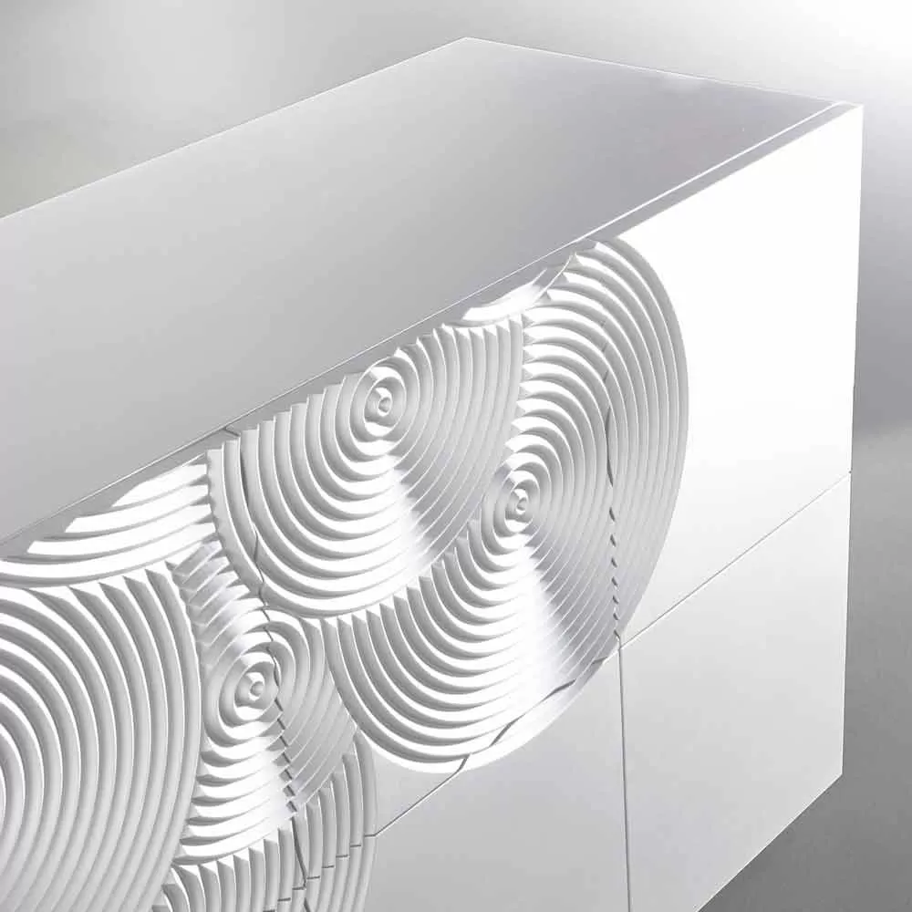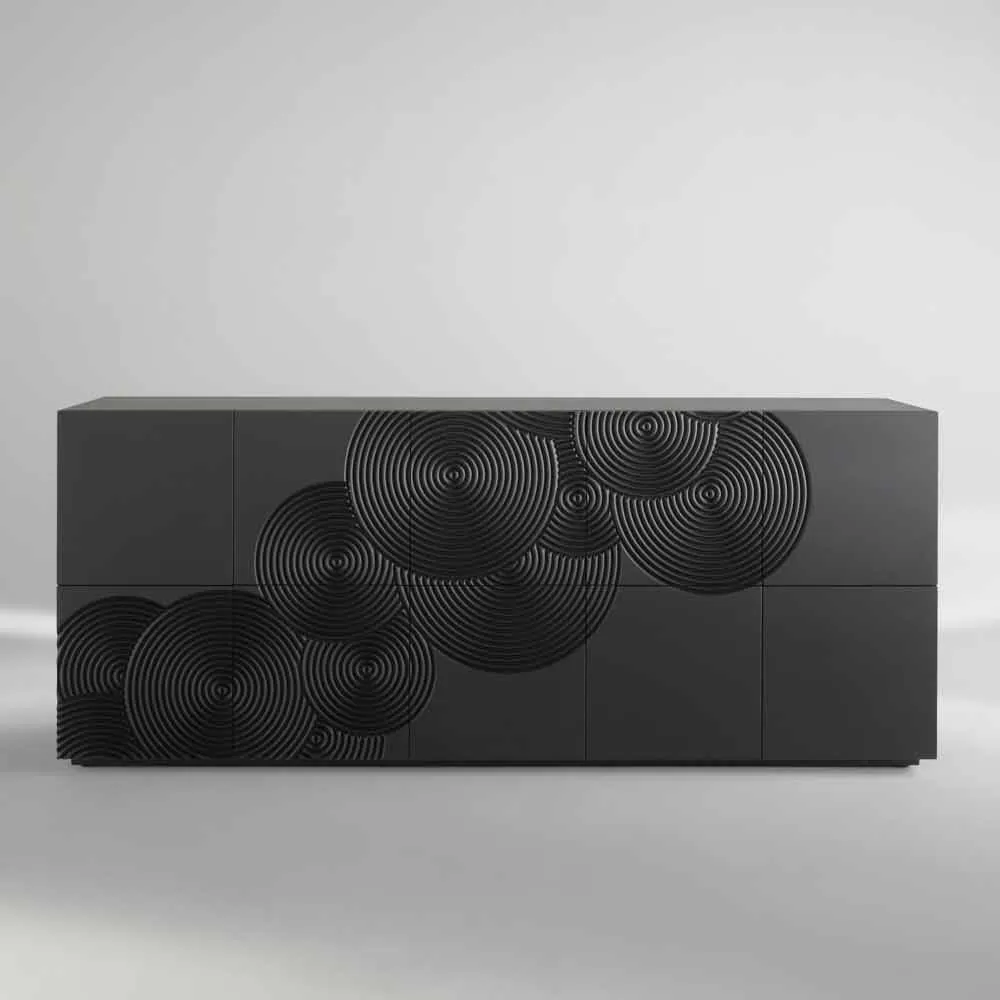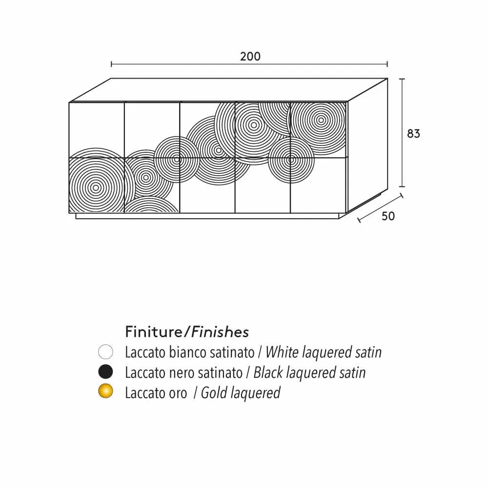 Designer sideboard with 10 decorated doors. The inner shelves are made of lacquered MDF.
