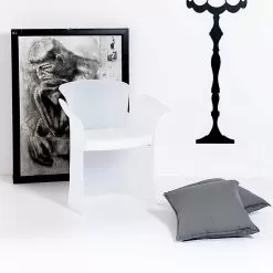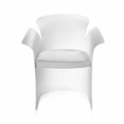 Elegant satin white easy-chair, made in 100% PMMA plexiglass from virgin polymers, thermoformed and laser shaped to create an exotic silhouette of a blossomed tulip. Self supporting. White colour ecological leather upholstery.