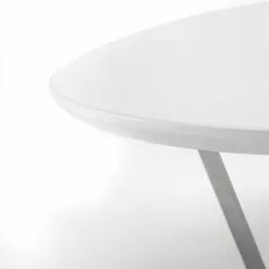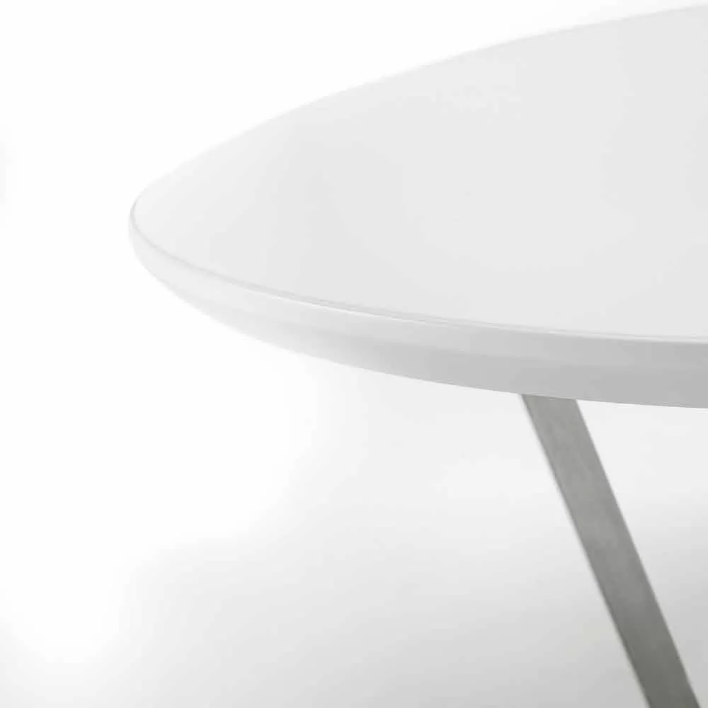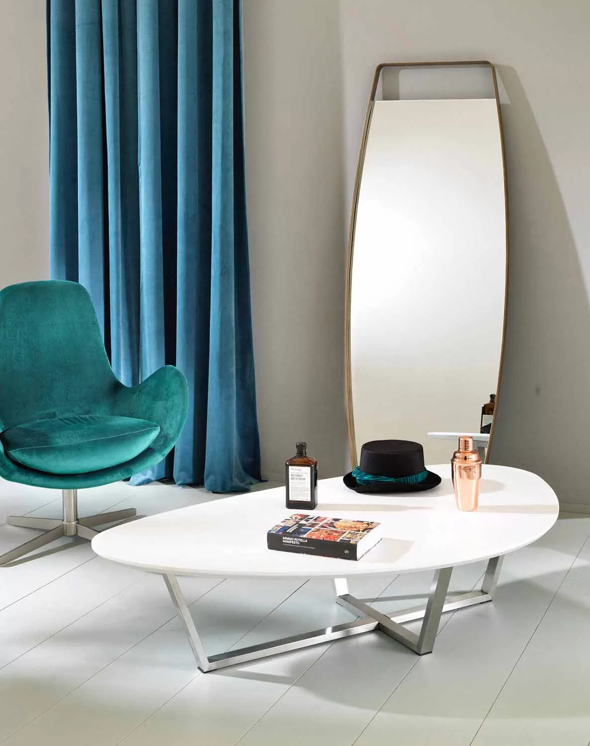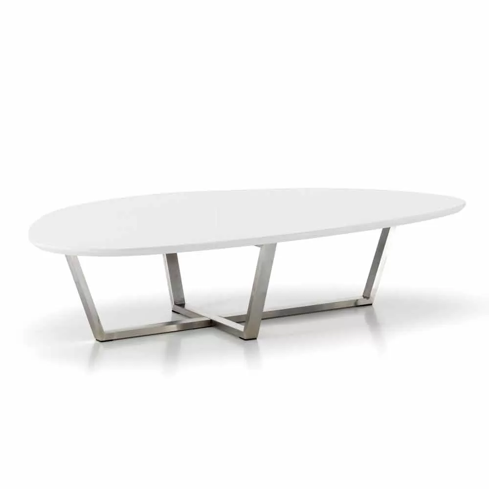 Shaped coffee table for living room of modern design with white mdf top and chromed metal base.