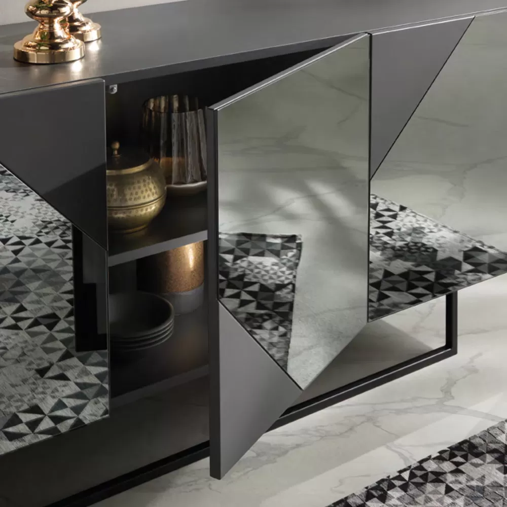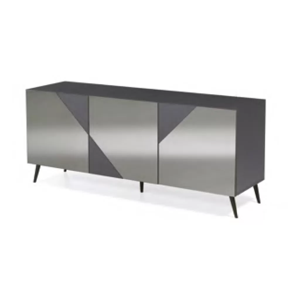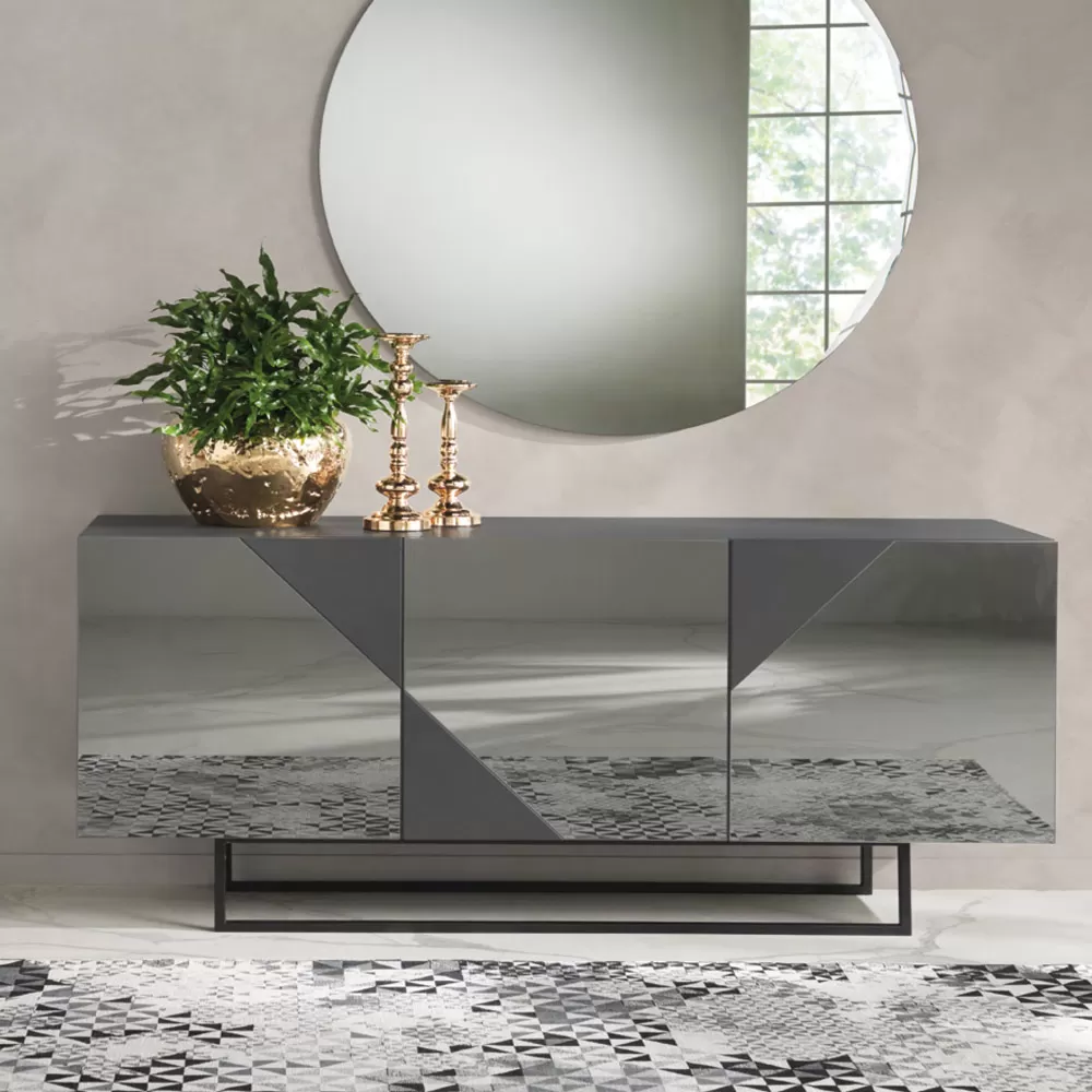 Living room sideboard with melamine structure, 3 MDF doors with a practical shelf each inside, enriched with elegant inserts in mirror-effect glass and base or feet in black painted metal . Made through a Made in Italy production process with quality raw materials , this marvelous decorative and functional element for the living area is characterized by a simple and essential design enriched by the unprecedented play of lines and geometric shapes that develops on the three doors.