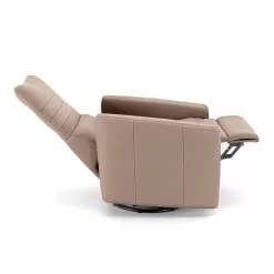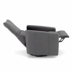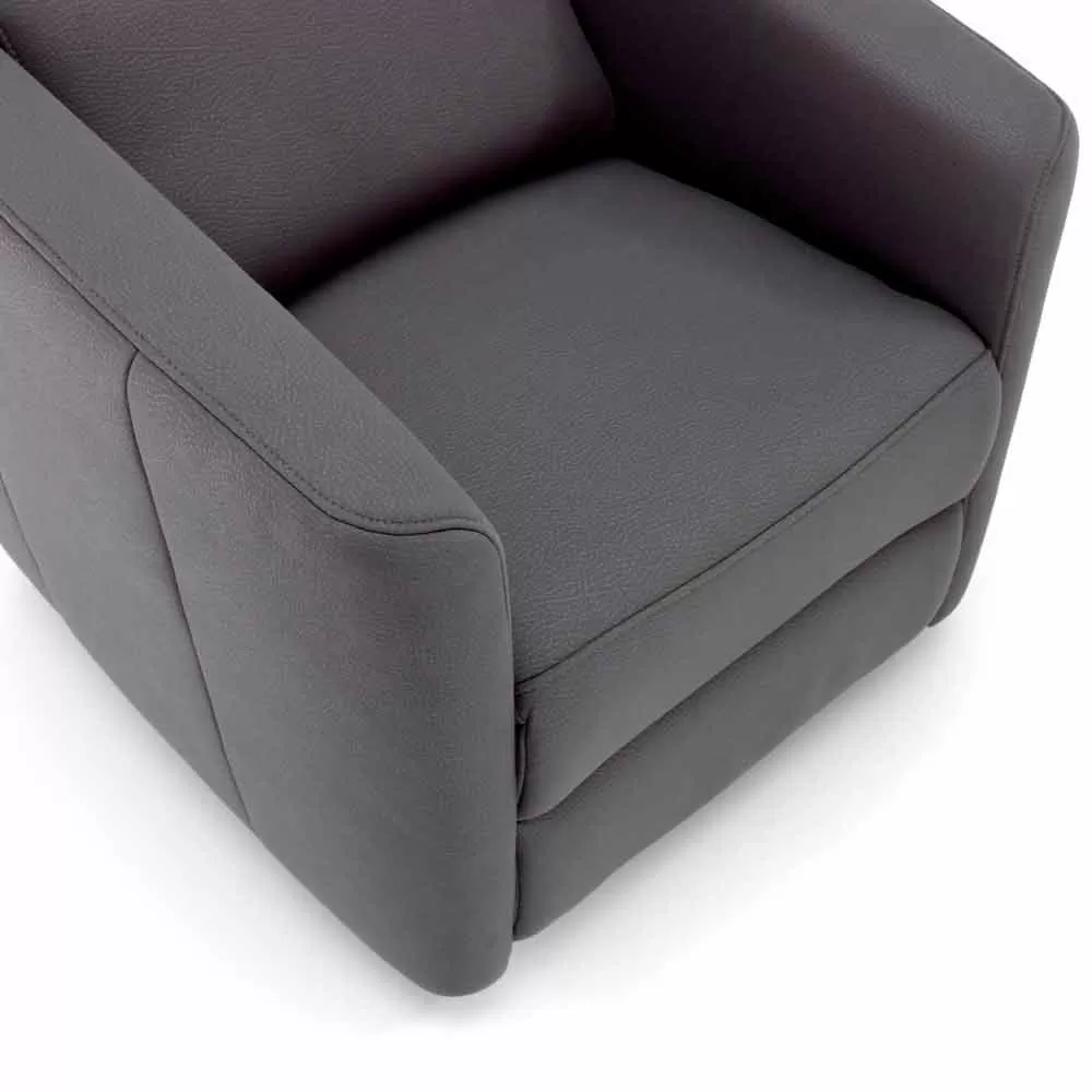 Modern design reclining and swivel armchair for living room with leatherette seat and chrome metal base.