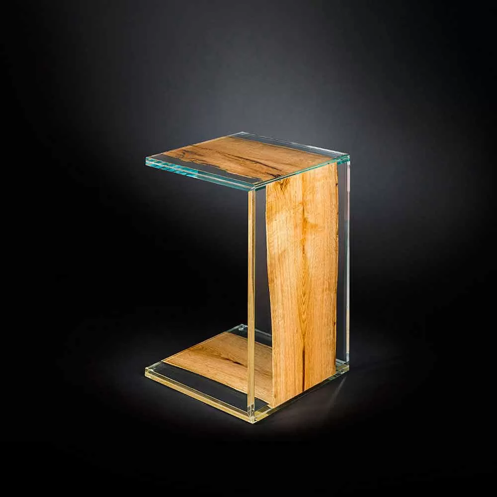 Venezia is a unique and extraordinary one leg side table, which encloses the history of Venice. Venezia is made from Briccola wood: “Briccole” are the posts standing in the lagoon of the city of Venice from immemorial time, that guide boats and alert. The table top is made of two layers of glass (10+10 mm). Between one layer and another, you will find a thin layer of aged briccola wood. The legs are made from curved glass.