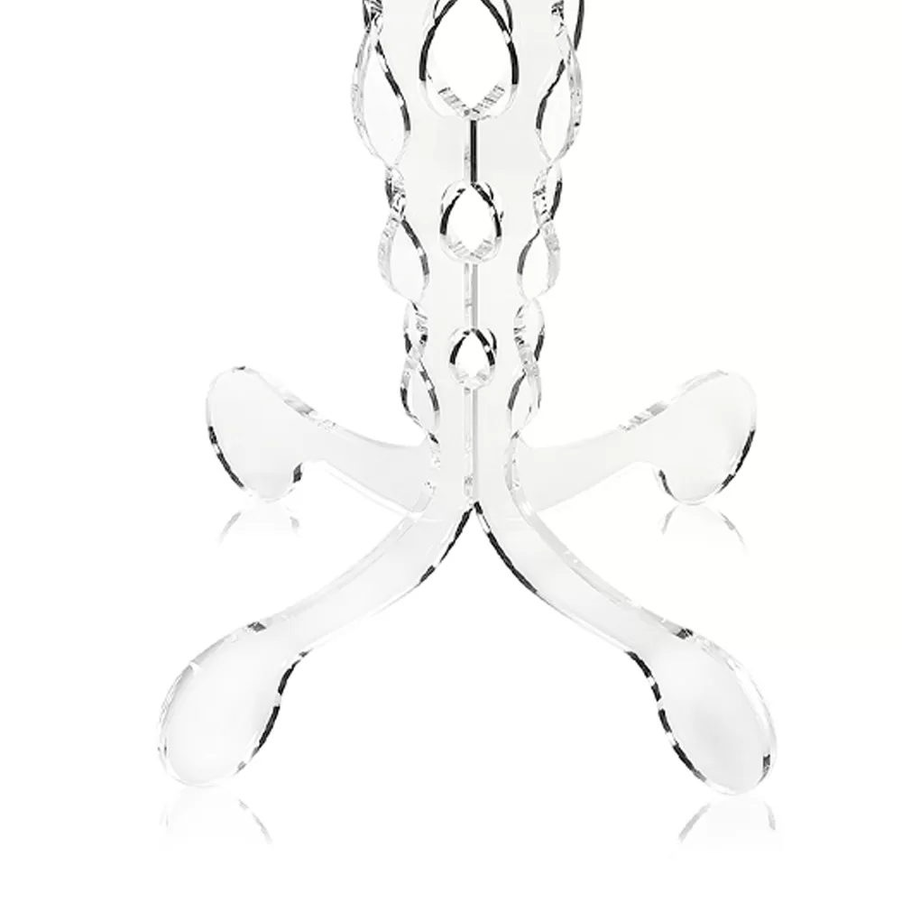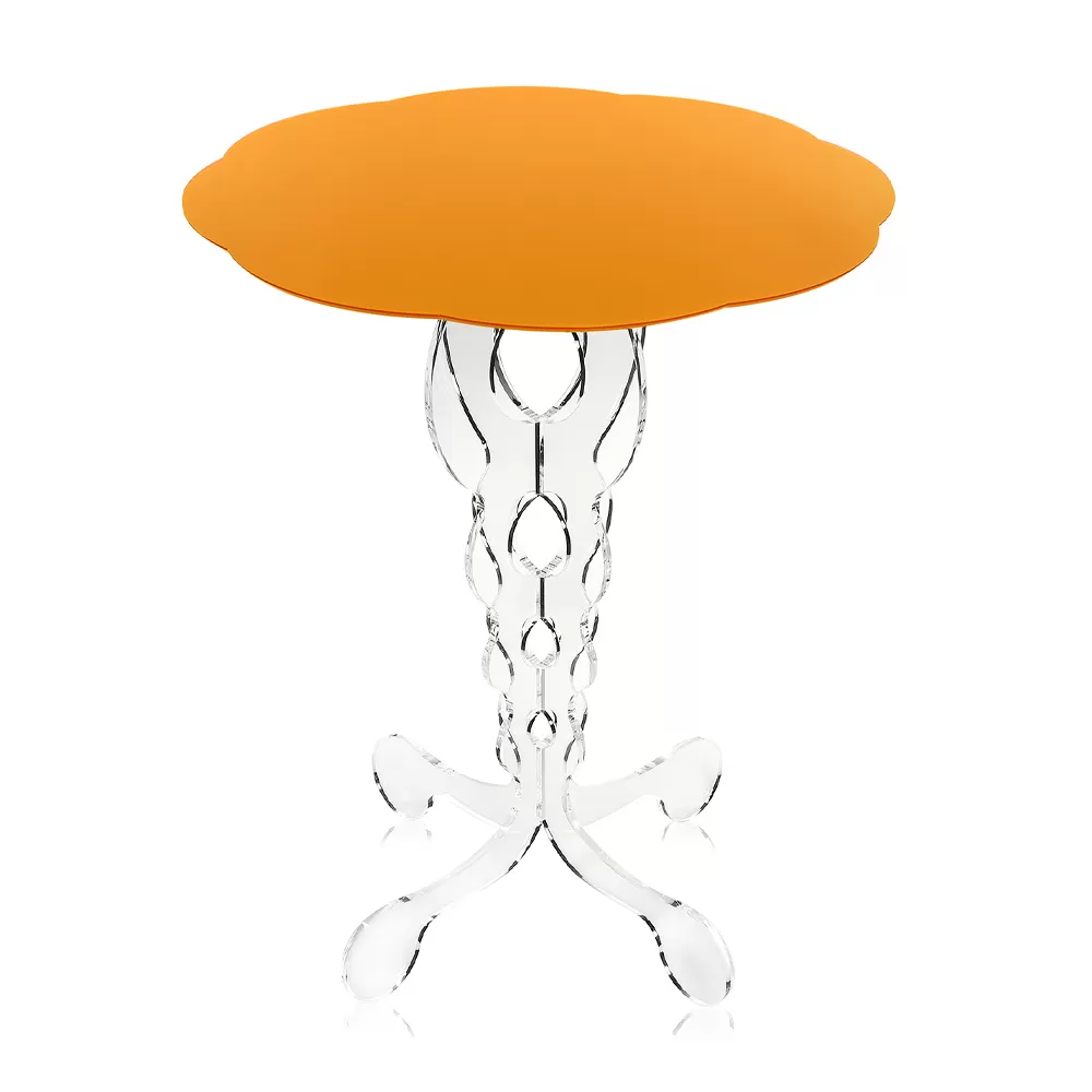 A moorish design characterises the Janis table, which can be used both as a coffee table or as a bedside table. The table base is made of laser-shaped 100% PMMA plexiglass. The table top gives a touch of color to the environment.