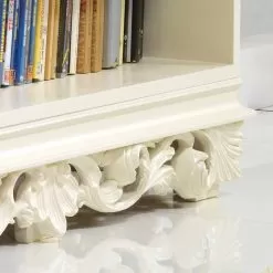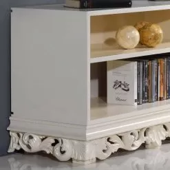 Rabel is a piece of furniture characterized by 4 open compartments that can be used to store books, decorative objects or souvenirs. It is characterized by a craftsmanship carried out using quality materials and using the experience of skilled Italian artisans. The structure is made of wood and has 4 practical compartments. The base is decorated with a classical motif. Cream lacquered finish. Made in Italy.