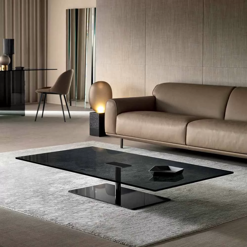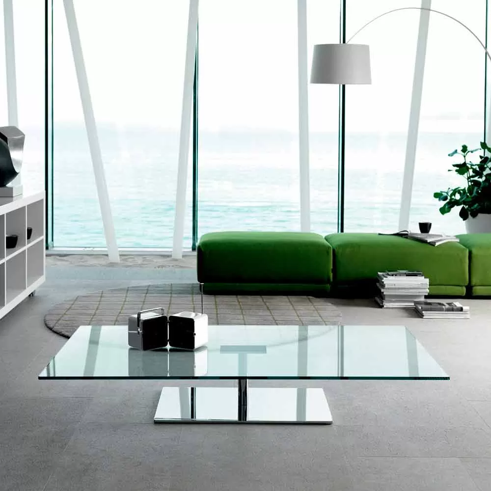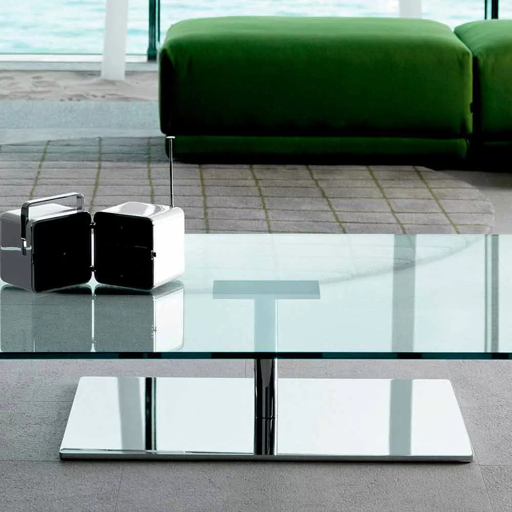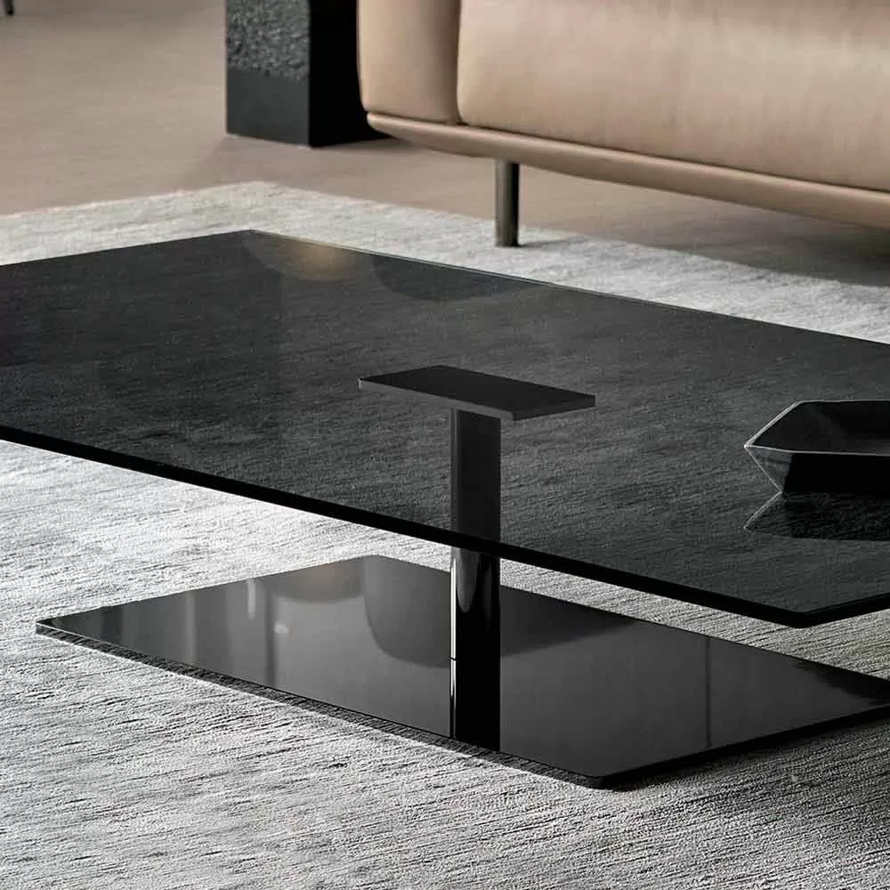 This low coffee table for the living room with a rectangular design is characterized by the top made entirely of glass and a metal support base in a chrome or gunmetal finish that creates wonderful light and three-dimensional effects.