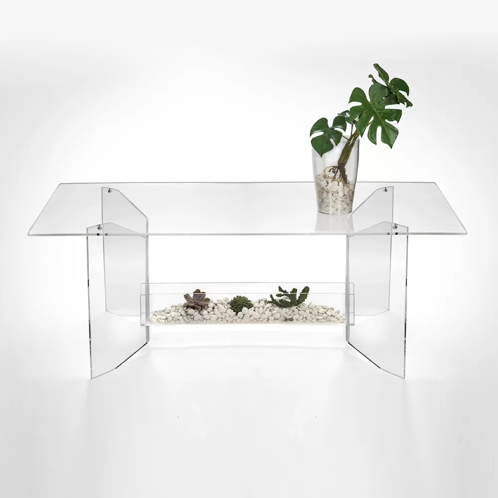 This living room coffee table is characterized by geometric references and a design made of 100% transparent plexiglass from virgin polymer. The perfect complement to give a glam touch to your living room.