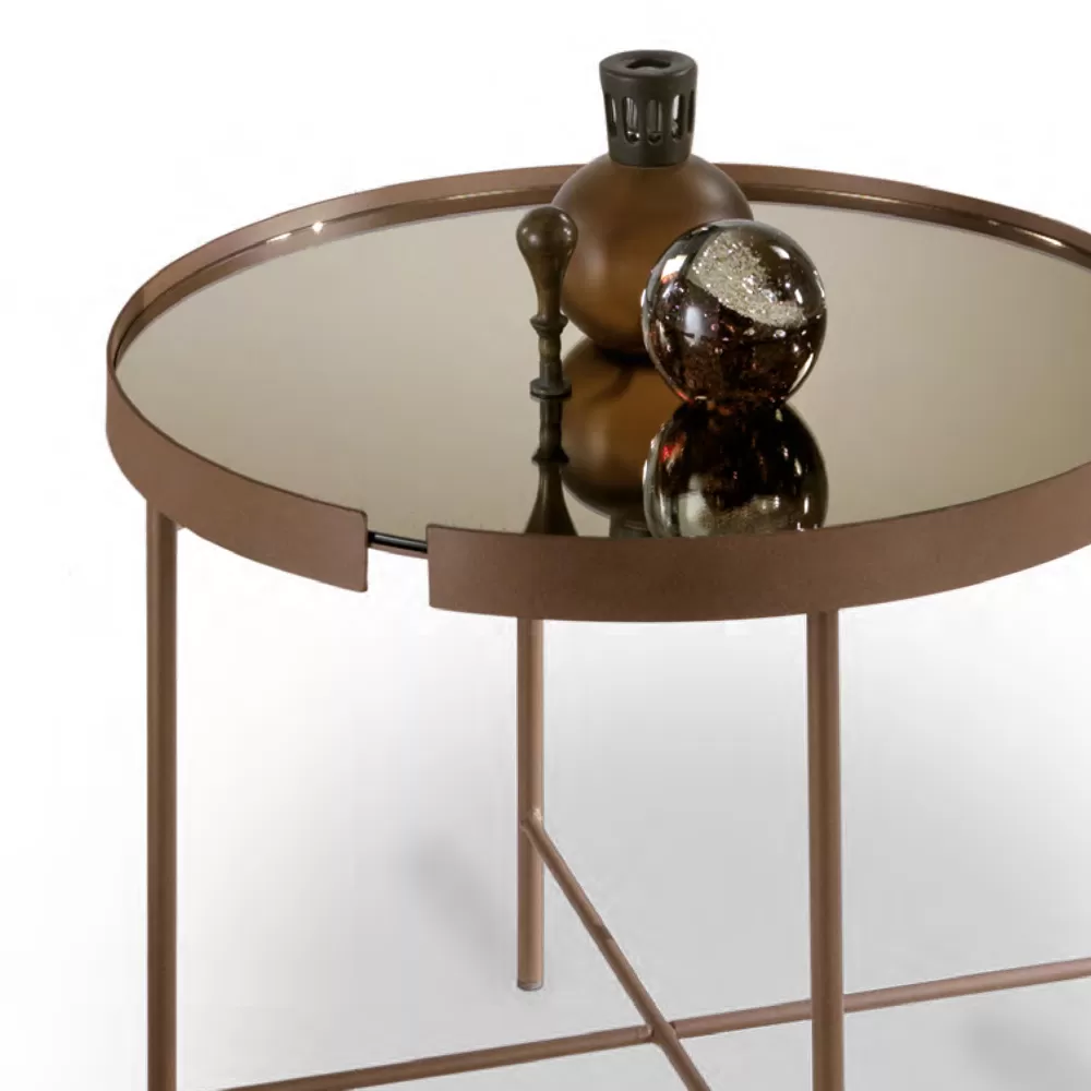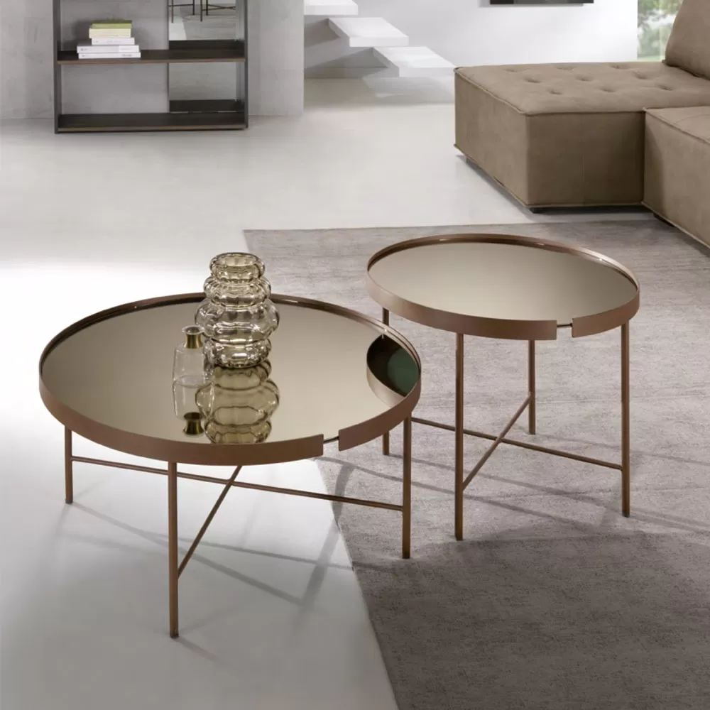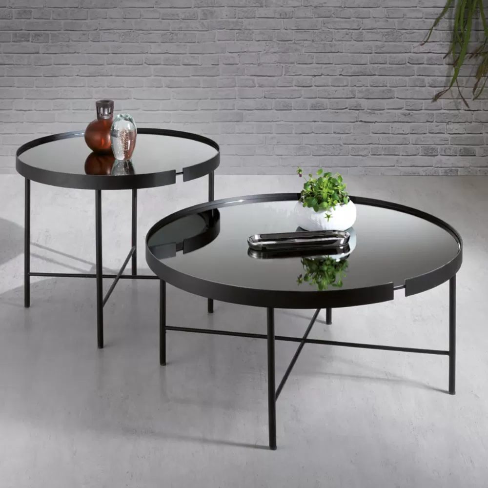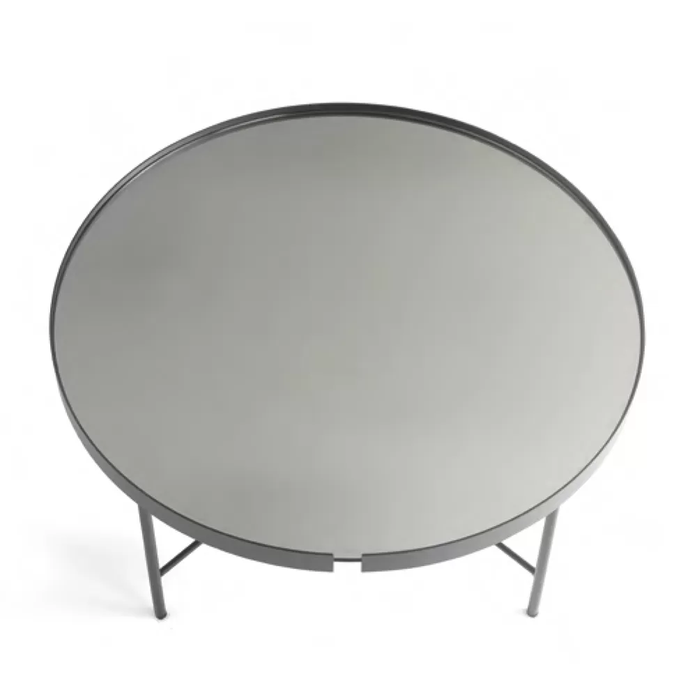 Coffee table made in Italy with round mirror-effect glass top and painted metal structure . A wonderful piece of furniture characterized by simple shapes and lines that make it particularly versatile, ideal for completing living areas with a contemporary style in an original way, completing the atmosphere and creating perfect harmony with the surrounding furniture. A modern and elegant design made unique by the refined touch of the mirror effect top that enriches the aesthetics making it unique and avant-garde. The perfect combination of selected materials and finishes offers an ideal solution for the two proposed sizes also allow you to create exclusive compositions capable of filling any living room with personality and character .