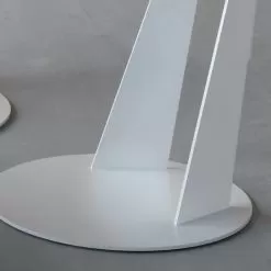 This round coffee table features a powder-coated embossed white metal base and a matte ceramic top on panel.