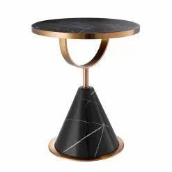 This coffee table has a structure made of resin and black marble effect stone with details in brushed copper finish stainless steel .