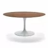 This white round coffee table features a lacquered mdf top and four leg chrome base .